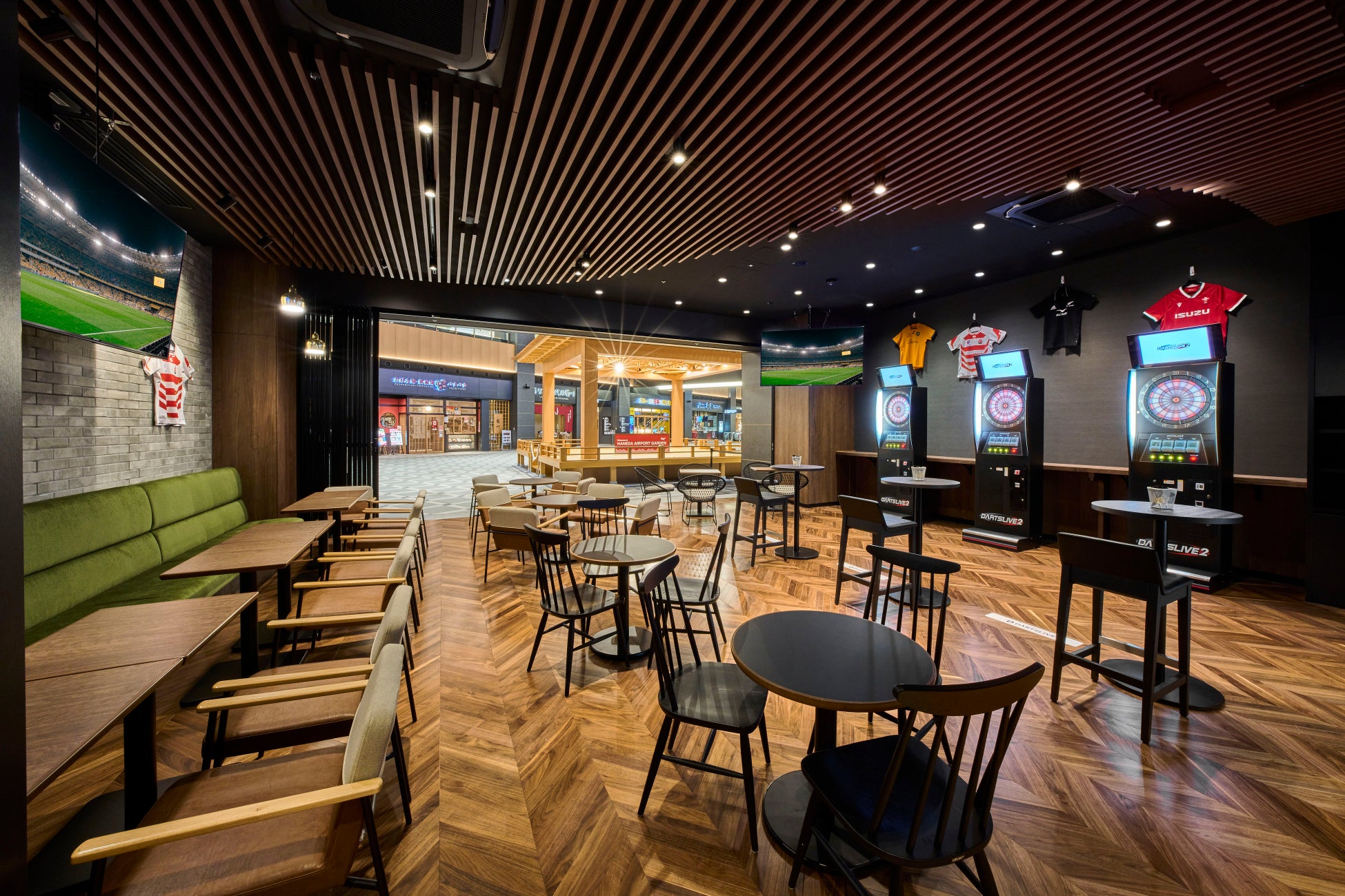 当施設は、深夜の空港滞在時の利便性を高める取り組みとして翌朝7時まで営業し、国内外の様々なスポーツが視聴できる映像設備をはじめ、言語を問わず楽しむことができるダーツ、各種アルコールやフードメニューを取り揃えております。
