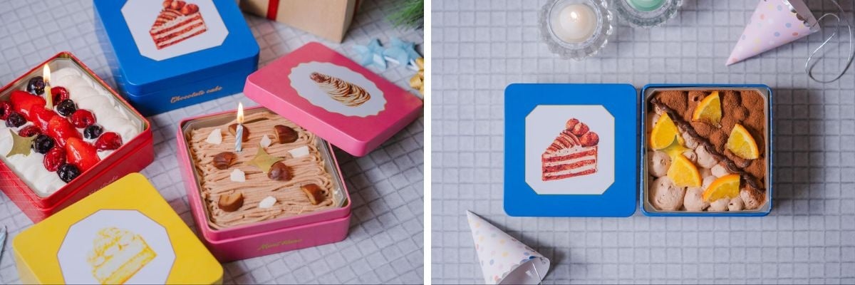 誕生日やお祝いなどのときめく瞬間に贈りたいギフトとして開発した、今までにない新しい誕生日ケーキです。”ときめき”は「嬉しい」「楽しい」そして「おいしい」瞬間に存在しています。その”ときめき”をケーキを食べた後にも思い出に残せるように再利用できる缶という形で表現しました。缶のデザインはお皿に乗ったケーキをイメージし、テーブルに華を添えるおしゃれなデザインは、これからの時期、クリスマスをはじめとしたパーティーにもぴったりです。