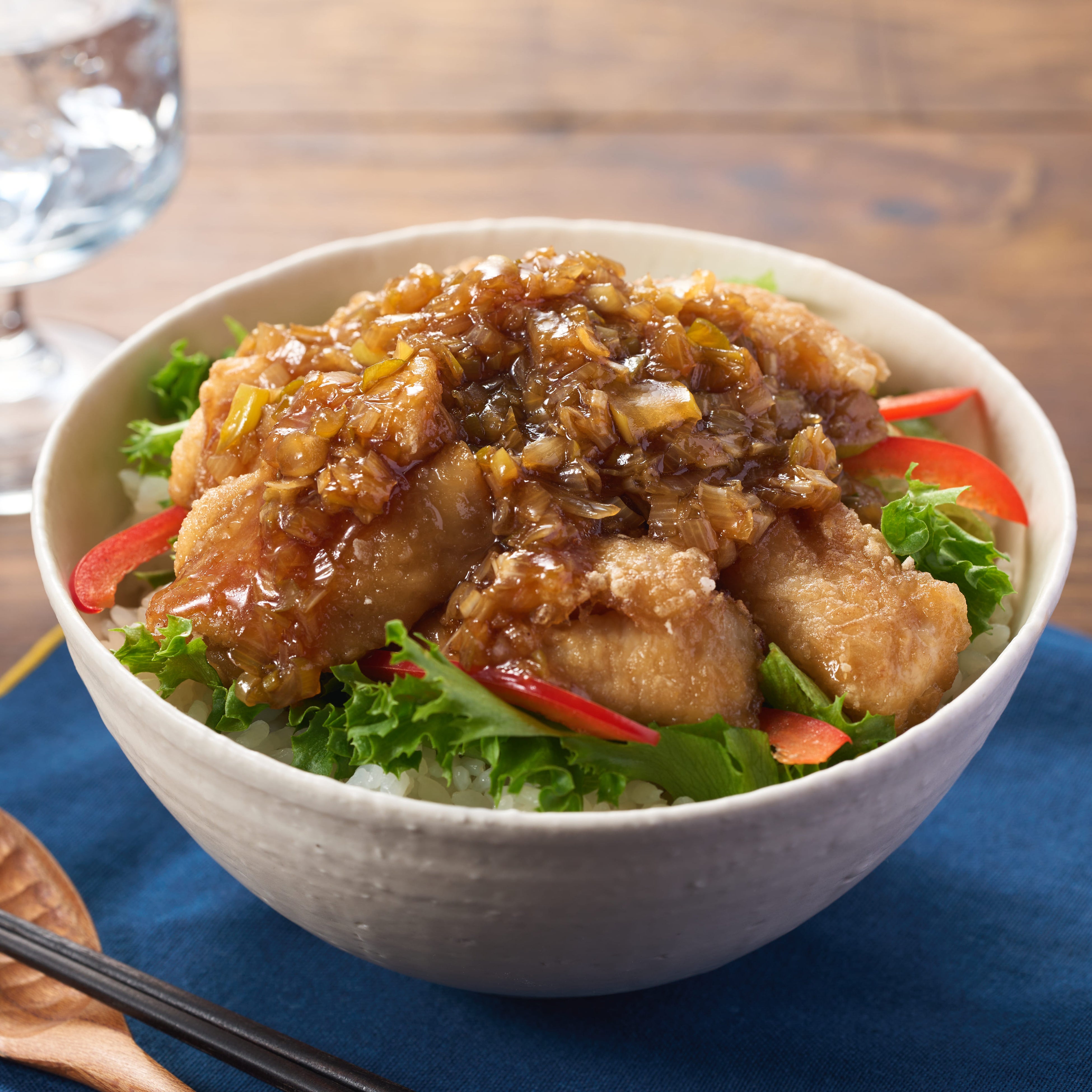 ねぎの青い部分は、白い部分に比べて強い香りと辛みがあり、濃い味付けにも負けず、油とも好相性。ねぎだれにして、無駄なくおいしくお召し上がりいただけるよう仕上げました。衣付けし、こんがり揚げた鶏の唐揚げを、彩鮮やかな野菜とともに豪快に白いごはんの上にのせた、ボリューム満点な油淋鶏丼です。ジューシーな油淋鶏の上にこだわりの「青ねぎだれ」をたっぷりかければ、香ばしい香りと青ねぎ特有の突き抜ける香りが口いっぱいに広がり、ごはんが進む味わいです。