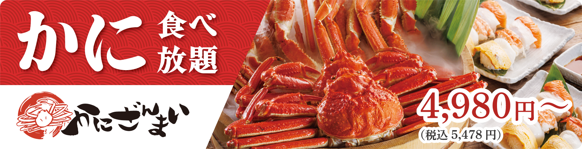 かにざんまいは、蟹、お寿司の食べ放題で、カニ三昧の食体験を満喫できる、味と演出にこだわった食のテーマパーク。身の詰まった大きな“蟹”を、驚きの価格で思う存分にお楽しみください。