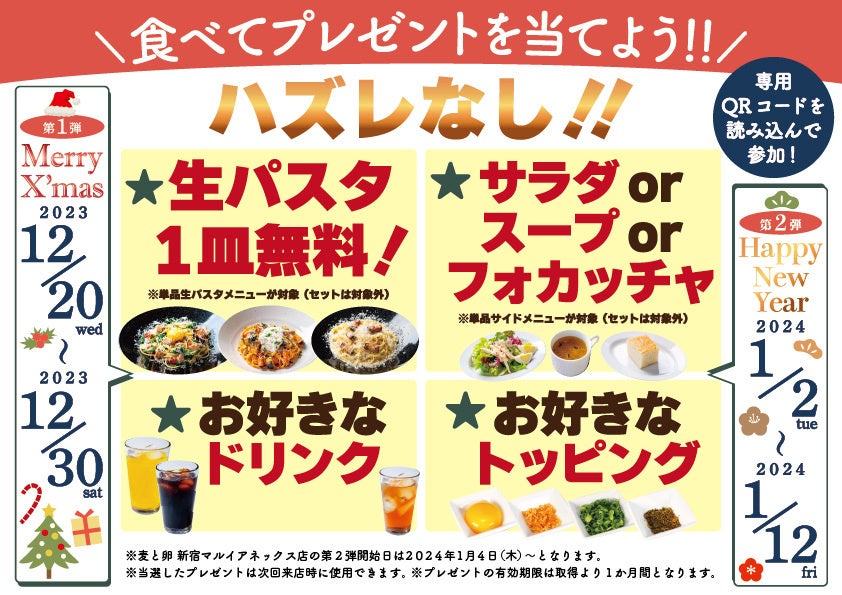 大当たりはパスタ1皿無料!他にもサラダや、フォカッチャ、スープ、トッピングやドリンクなどが当たるキャンペーン!ぜひこの機会に「麦と卵」でお腹も心もハッピーな時間をお過ごしください。