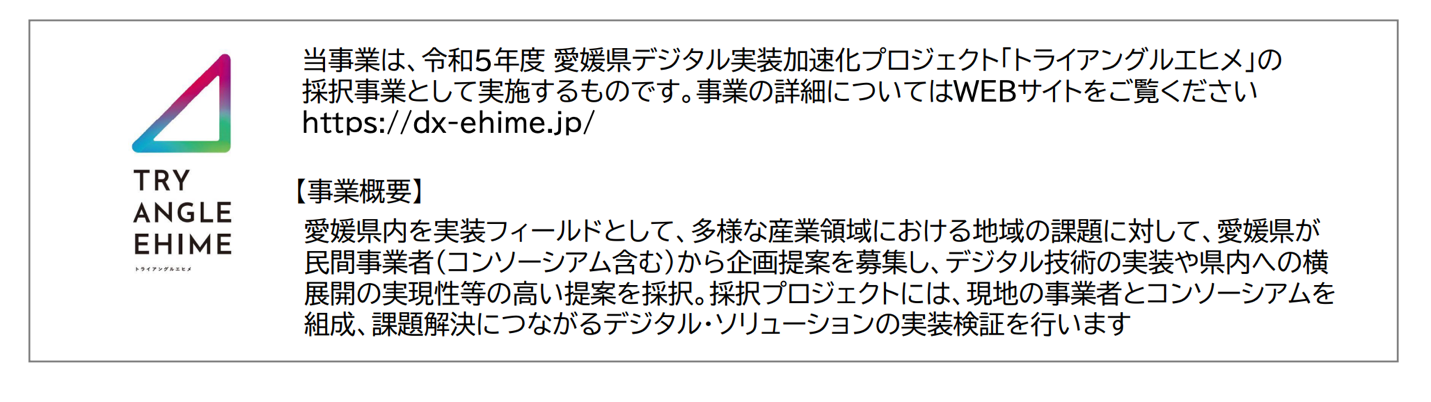 「トライアングルエヒメ」は、2022年度にスタートした、愛媛県によるデジタルソリューションと関連技術を愛媛県内事業者・自治体などに実装し、地域課題の解決にチャレンジするデジタル実装加速化プロジェクトです。詳細はウェブサイト(https://dx-ehime.jp/)をご覧ください。