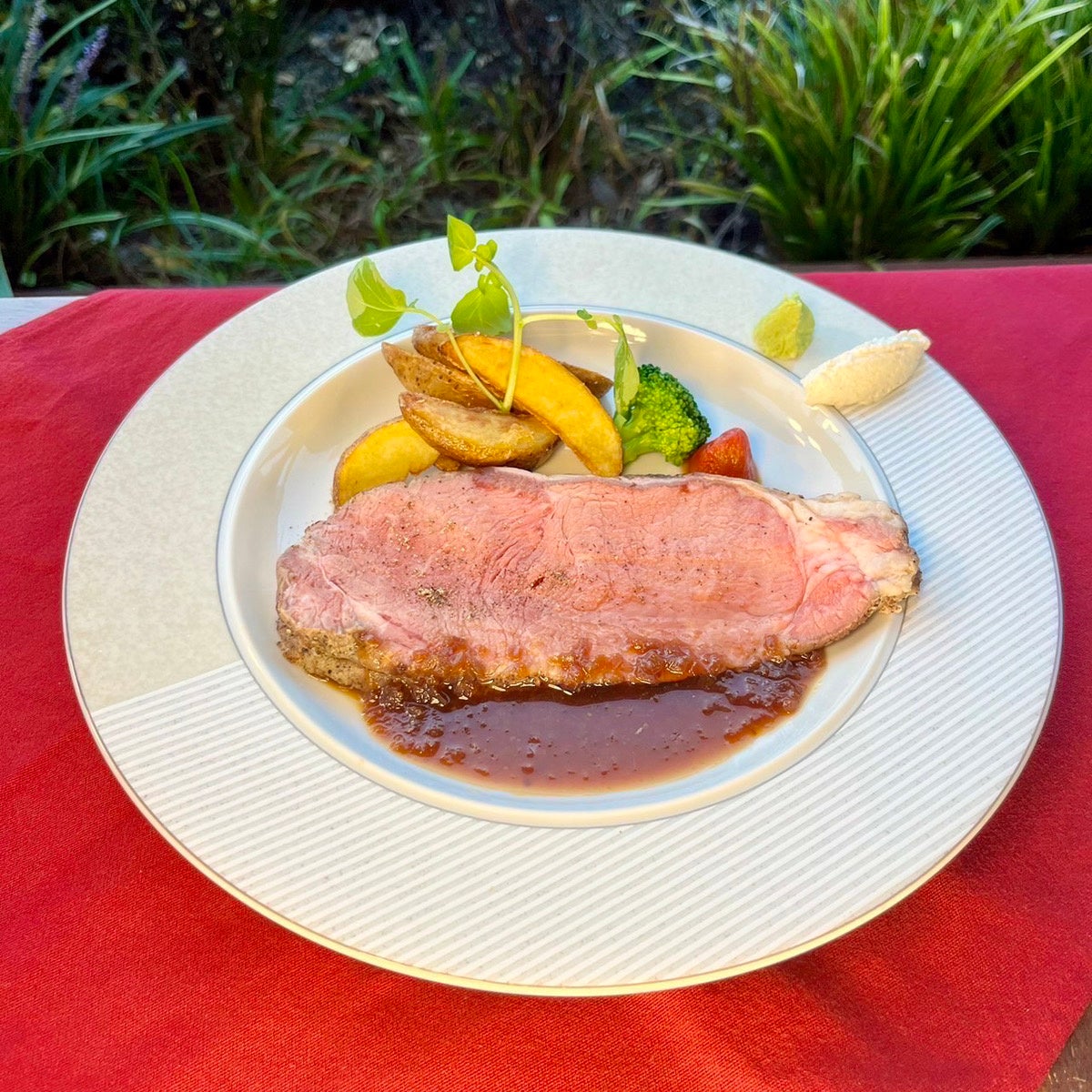 メイン料理であるローストビーフはお野菜と香草で2日間マリネしローストして豪快に見た目も華やかに御提供します!早期予約特典のトリュフを添えれば、より気分も高まること間違いなしです♪