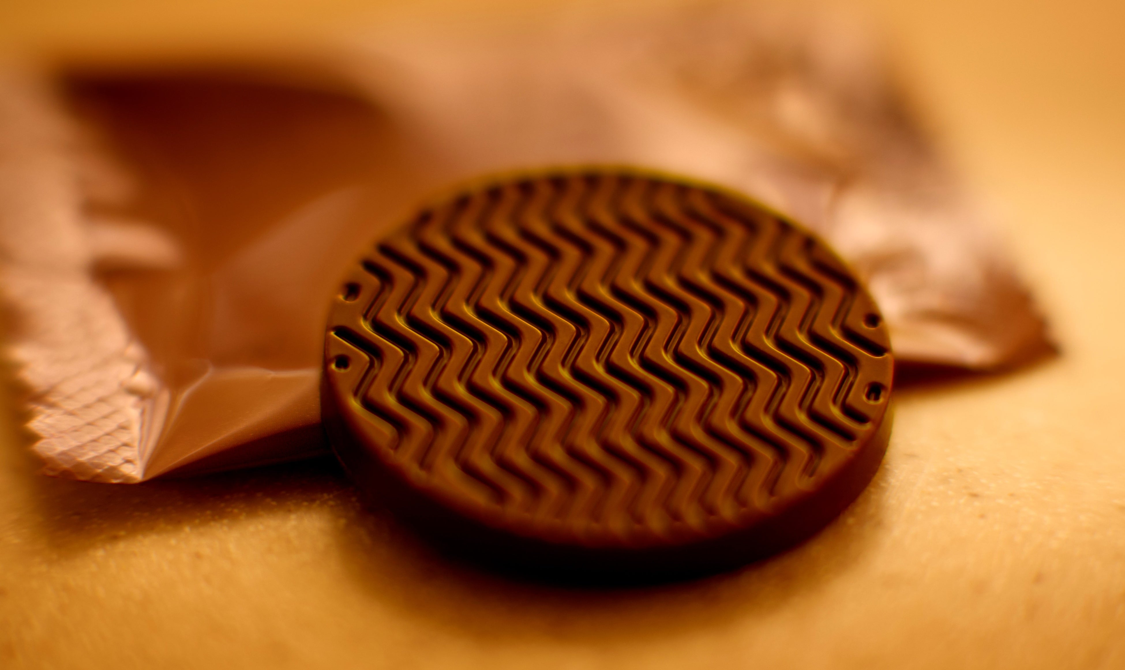 コーヒー焙煎豆を粉砕し、その粉砕物と、別途コーヒー豆から抽出されたコーヒーオイル(食品中1%以上5%以下)、硬化油を混合・混錬する。これを成型して固めることで、コーヒー微粉砕物がコーヒーオイルや硬化油でコーティングされ、コーヒーの香りがしっかりと閉じ込められ、口に含んだときにコーヒーの香りが溢れ出す食品を製造する技術。
