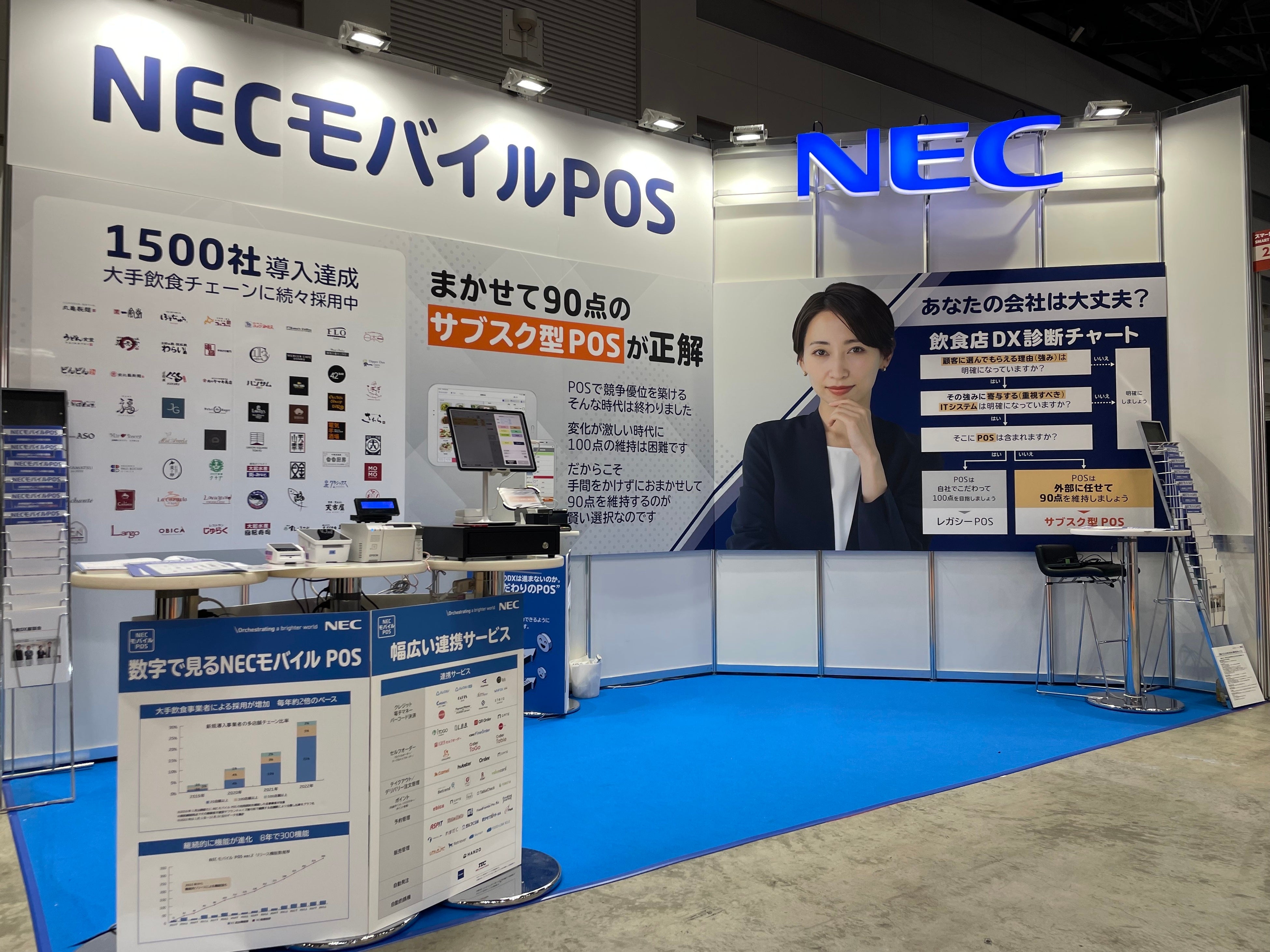 展示ブースでは、NECが考えるサブスク型POSの本質的な提供価値と、その提供価値を評価して導入を始めた大手飲食チェーン様の事例を紹介しました。
