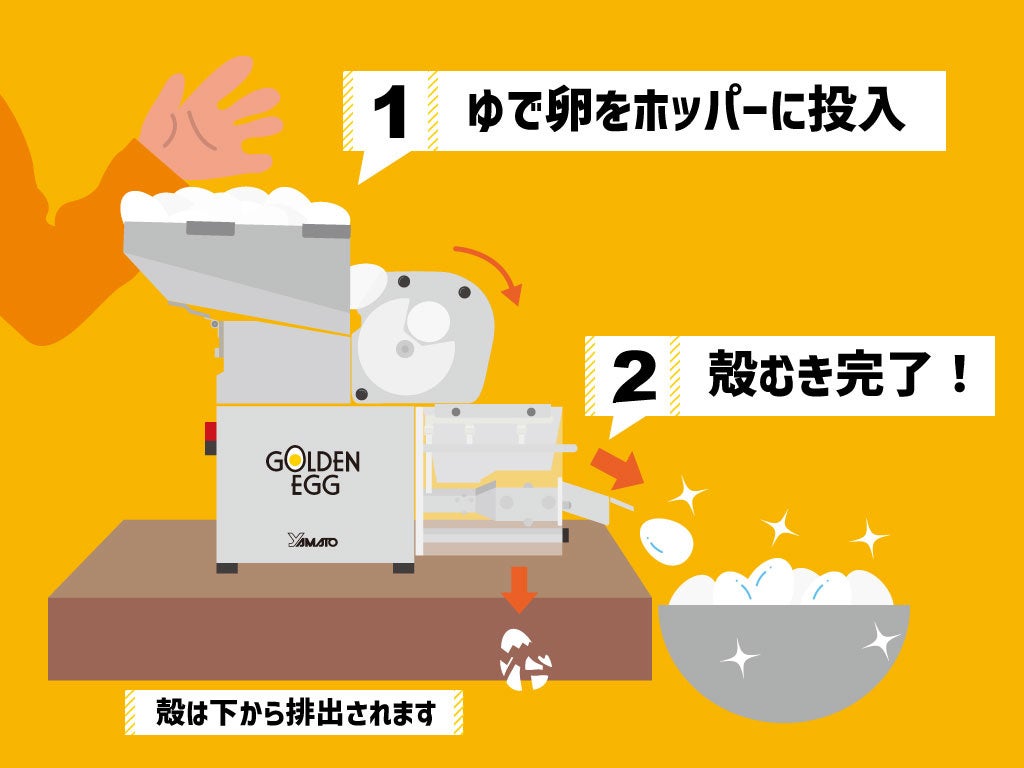 ゴールデンエッグは、とろとろ半熟の茹から卵でも固茹で卵まで自動殻むきできる世界初のマシンです。ホッパーに茹で卵を補充するだけで、ゴールデンエッグが自動で殻むきしてくれます。大容量ホッパーを設置する場合でも、同じくホッパーに茹で卵を補充しておくだけで、ゴールデンエッグに茹で卵が流れていき、自動的に殻むきできます。