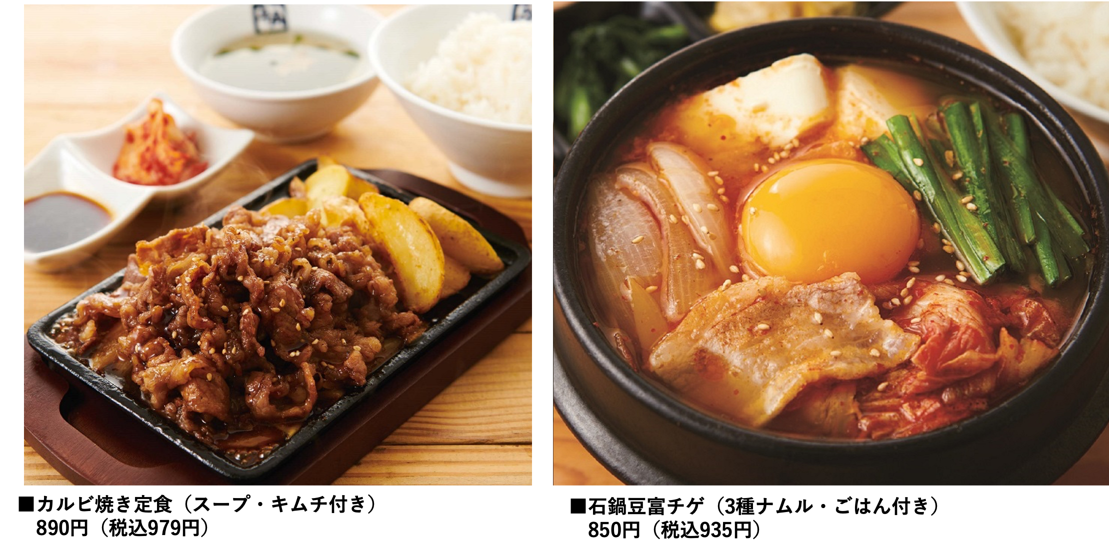 メニューは、熱々の鉄板焼肉で提供する焼肉定食を始め、ボリュームのある丼や冷麺、チゲなど焼肉屋さながらのバリエーションを用意しています。カルビ焼き定食 890円(税込979円)とお財布にも優しく、定食や焼肉丼はごはんが大盛り無料なのでお腹いっぱい食べられます。定食はスープとキムチ、焼肉丼はスープが付いてきます。
