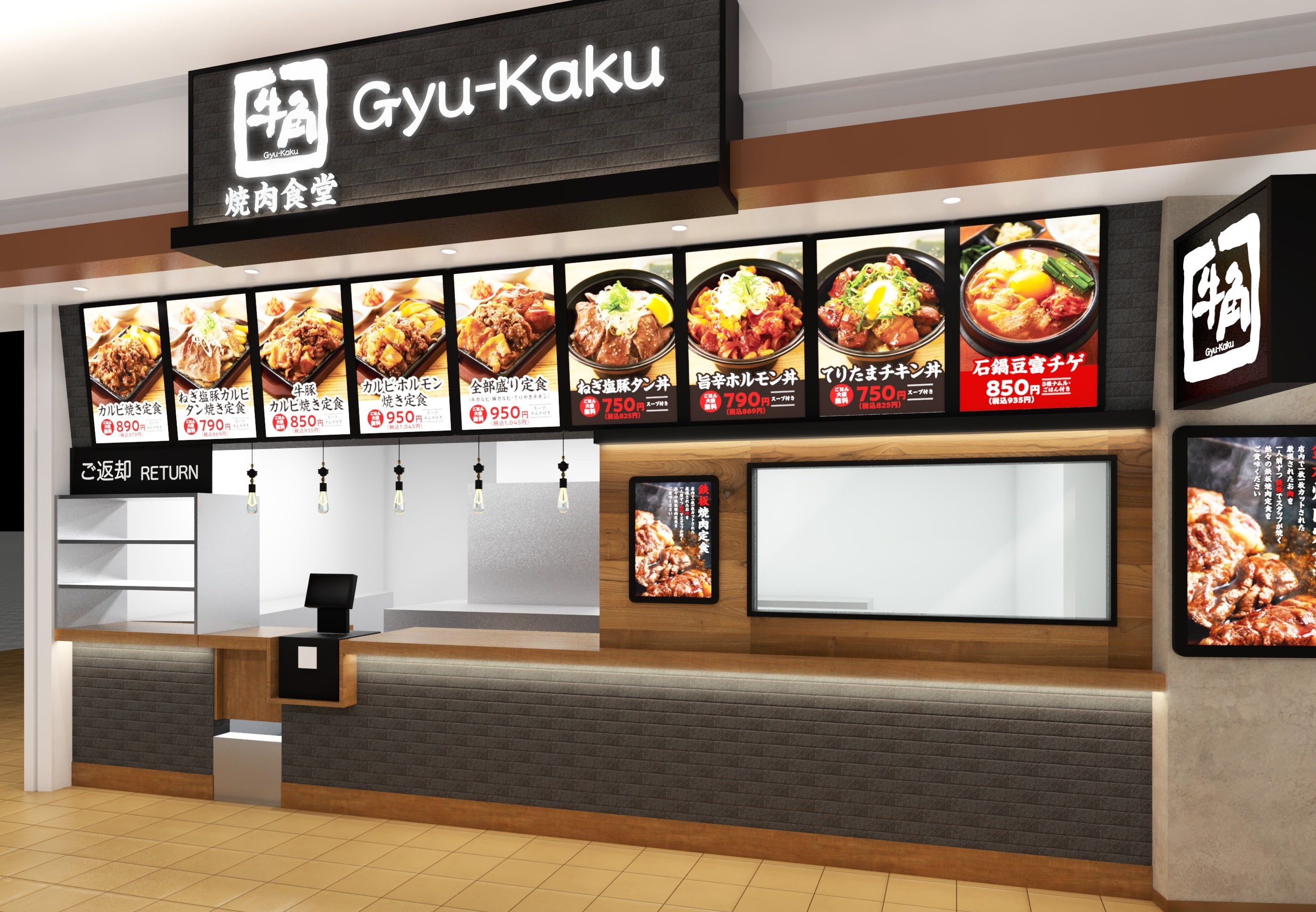 焼肉チェーン店で店舗数No.1を誇る牛角がプロデュースするフードコート専門店、「牛角焼肉食堂」。注文ごとに店前の鉄板で肉を焼くライブ感とシズル感をお楽しみいただけます。