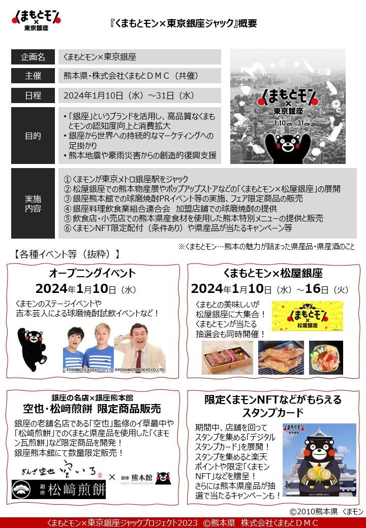 詳しくは「くまもとモン×東京銀座ジャック」HP(https://kumamotomon.com/tokyo/)にて随時発信しますので、ご確認下さい。