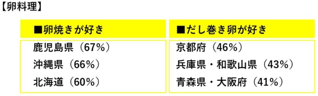 一方で、【家庭料理のメニュー】における嗜好も調べてみたところ、こちらも地域差があることが分かりました。例えば、同じ「たまご」という食材を料理するとしても、九州・沖縄や北海道では卵焼きを好み、関西ではだし巻きを好む傾向がみられました。また、九州や沖縄では地元愛を感じる「郷土料理」を好み、首都圏では家庭でも「イタリア料理」を好む、といった結果が出ています。