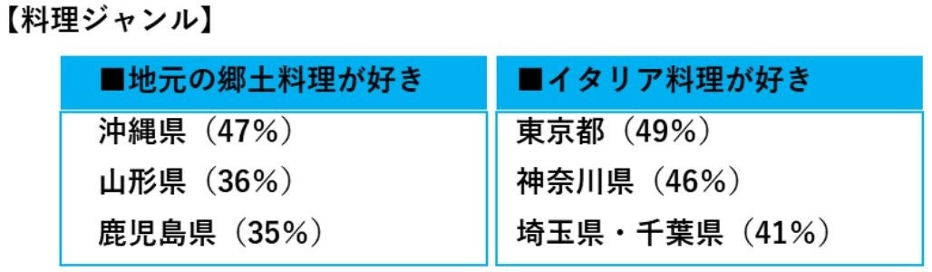 今回の調査では、自宅でよく作る料理や好きな料理のジャンル、料理によく使う食材・調味料などの定量調査を実施し、家庭内料理においての都道府県別の差や違いを分析。好む料理や味付けに傾向がみられる、同じ食材でもよく作る料理が違うなど、地域により相違点があることが明らかになりました。