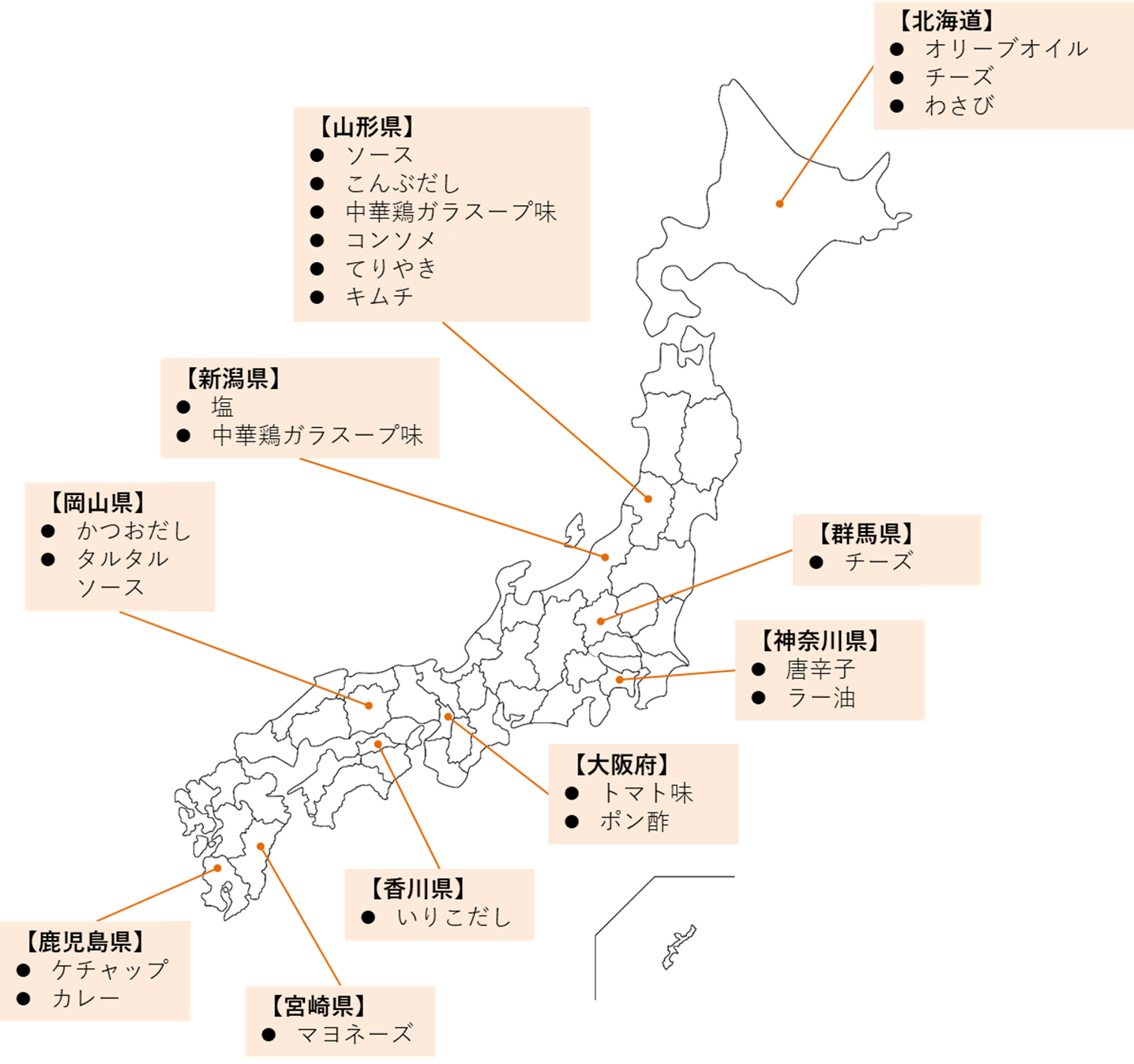 一方で、「岡山県(タルタルソース)」「神奈川県(唐辛子やラー油)」のように、地域の特産などとは関係なく、その都道府県の家庭料理として愛用されている調味料や味つけがあることも分かりました。