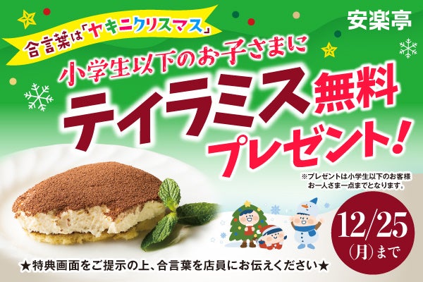 ご注文時に特典画面を従業員へご提示の上、合言葉「ヤキニクリスマス!」とお伝えいただくと、小学生までのお子様1名様につき1点ずつ「ティラミス」をプレゼントいたします。