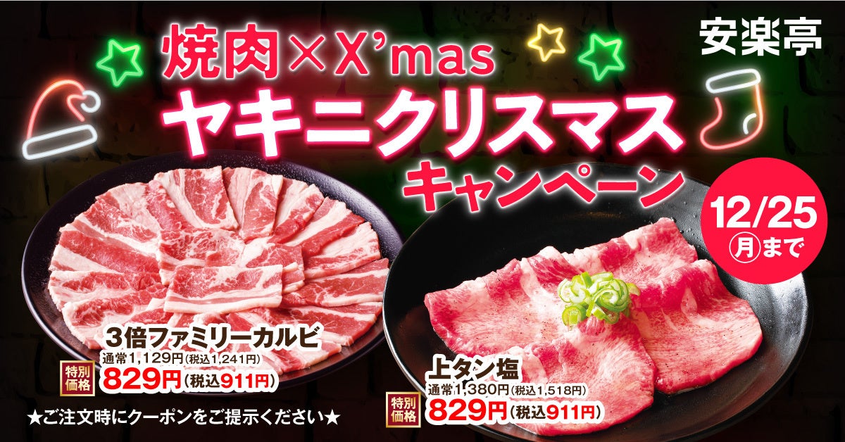 焼肉レストラン安楽亭(本社:埼玉県さいたま市、代表取締役:柳 先)は、2023年12月15日(金)より、焼肉が大好きな皆さまにメリークリスマス!の気持ちを込めた「ヤキニクリスマス キャンペーン」を実施いたします。「ヤキニクリスマス」の合言葉で、お子様お1人ずつにデザートをプレゼント!さらに、上タンなど人気の焼肉メニューを特別価格でご提供します。