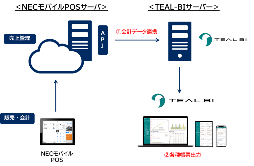 今回の連携により、NECモバイルPOSのクラウドサーバからTEAL BIのサーバへ売上データが自動で取り込みされるようになりました。