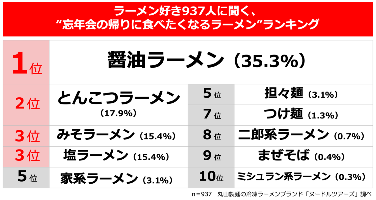 3位はどちらも北海道が発祥と言われている「みそラーメン」と「塩ラーメン」で、王道のラインナップが上位にランクインする結果となりました。「みそラーメン」は、「温まる」「沁みる」と言ったワードが多くあげられ、「塩ラーメン」はさっぱり味のイメージから「お腹いっぱいでも食べられそう」という声もありました。
