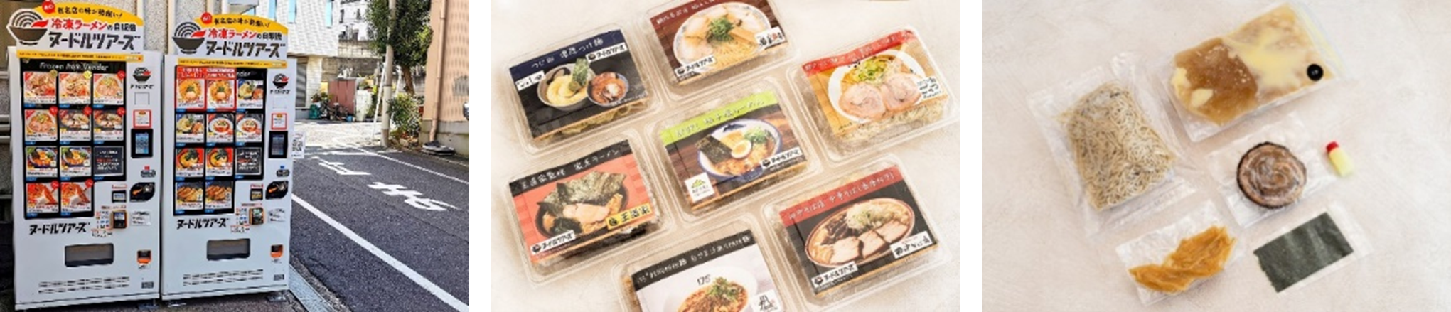 『ヌードルツアーズ』は、全国の各ラーメン店が作ったスープと、厳選した原料と衛生管理を徹底した丸山製麺の製麺所で製造した冷凍生麺を使用したコラボ商品を冷凍で販売しています。価格は1つ1,000円で、自販機や無人販売所で販売しており、24時間いつでも好きな時に購入可能です。スープは湯せん、麺はゆでるだけのカンタン調理で、自宅にいながら日本全国のラーメン屋さんのラーメンを味わうことができます。2021年3月のサービス開始以降、全国25以上のラーメン屋さんと提携し、設置数は日本全国200箇所以上、販売食数は累計50万食を突破しました。今後も多種多様な業界や企業との連携により成長を続け、全国への設置を目指します。