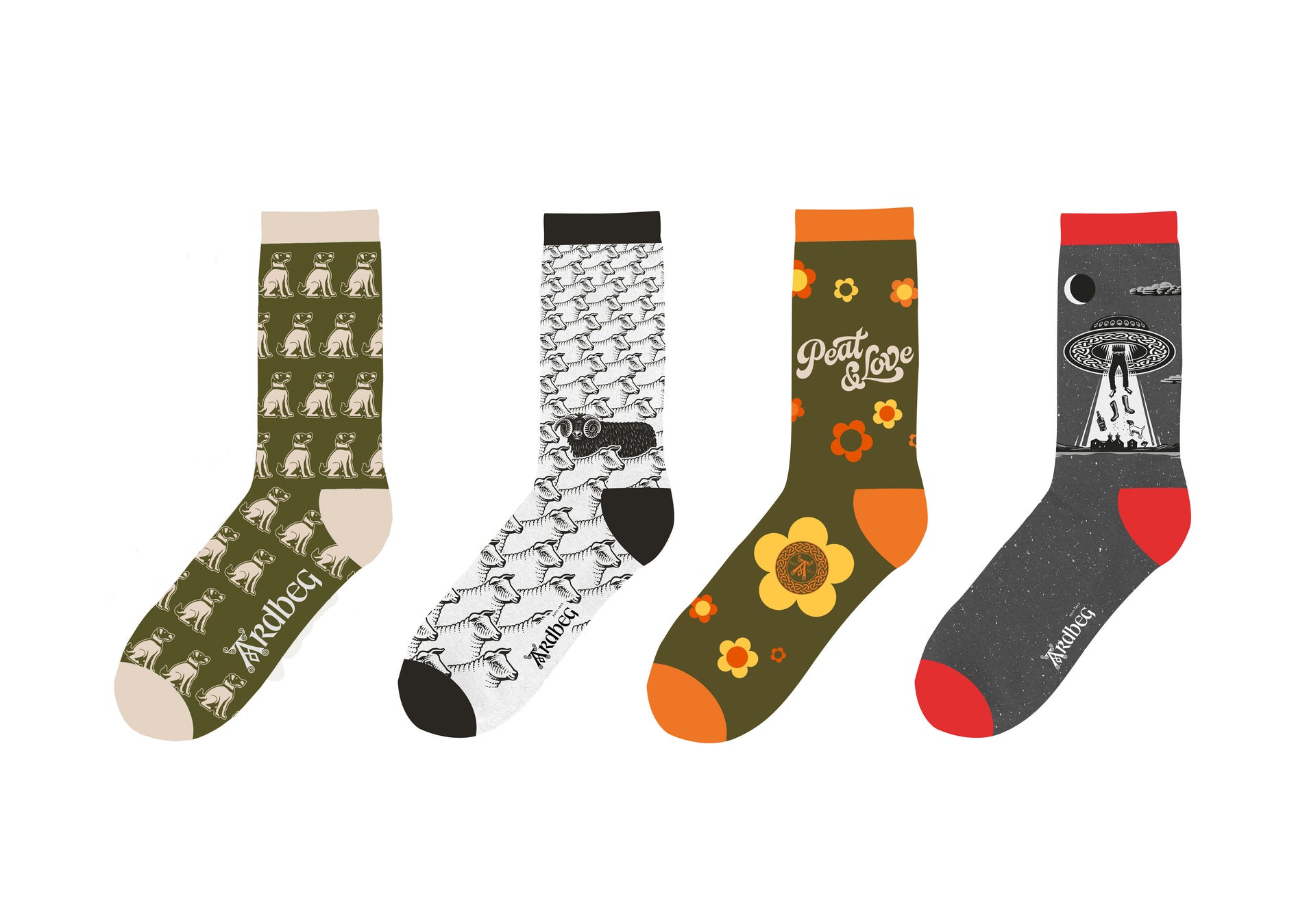 ホリデーシーズンに合わせて、雪をイメージした白い背景に、蒸留所のマスコット犬ショーティーがプレゼントを運ぶ様子があしらわれたキュートなホリデーギフトパッケージがセットになっています。さらに、ラッキーな方にはアードベギャンでなくてもキュンとくる、これまでのアードベッグ・デーのモチーフなどをあしらったオリジナルの靴下が、4種類の中からランダムに1種類が同封されます。