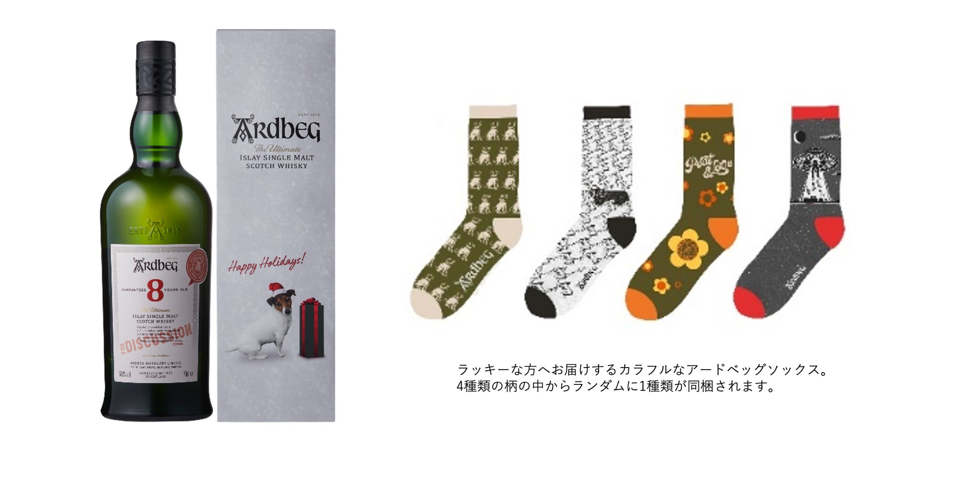 アードベッグ ソックスがセットになった、「アードベッグ 8年 ホリデーギフトパッケージ」