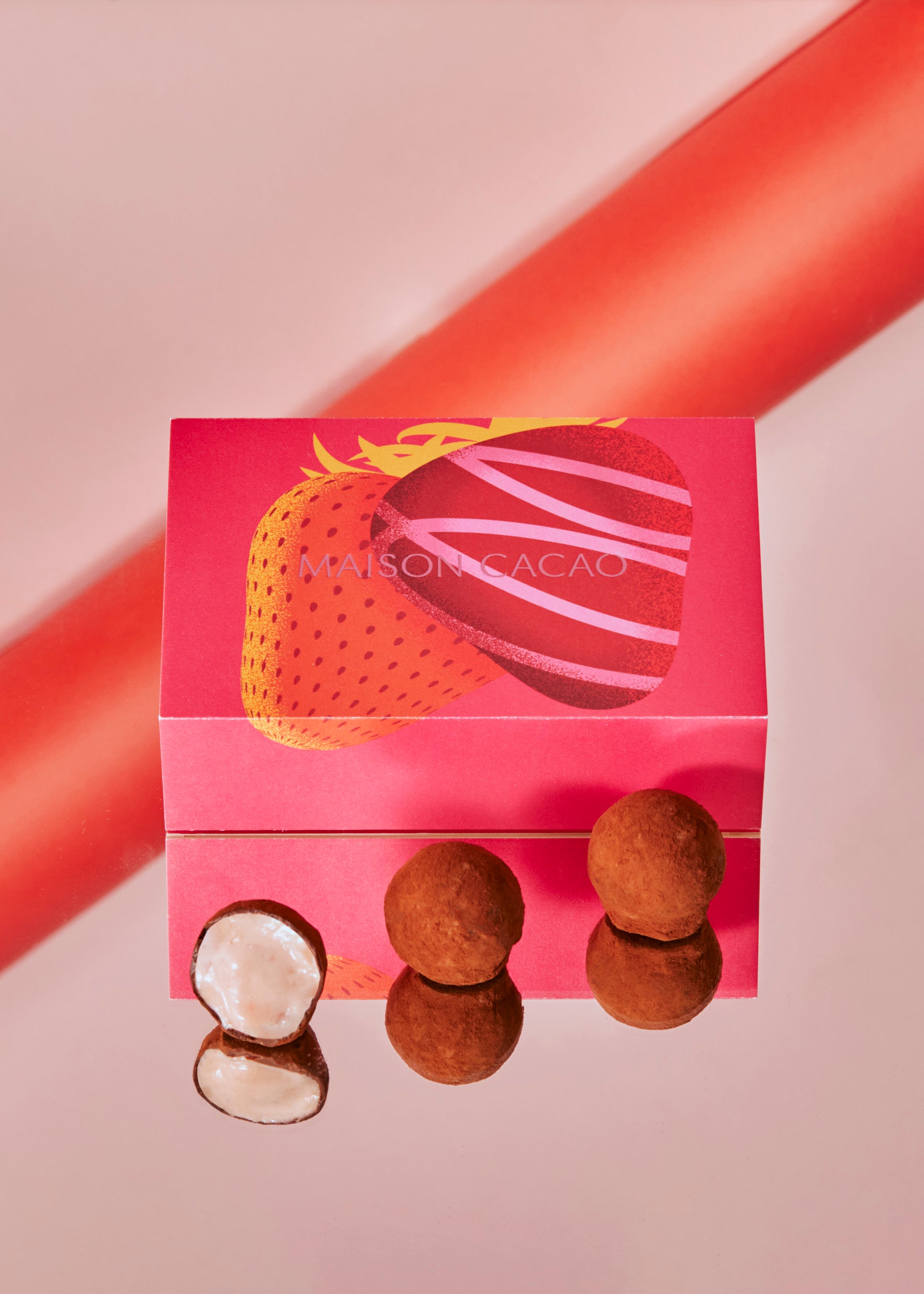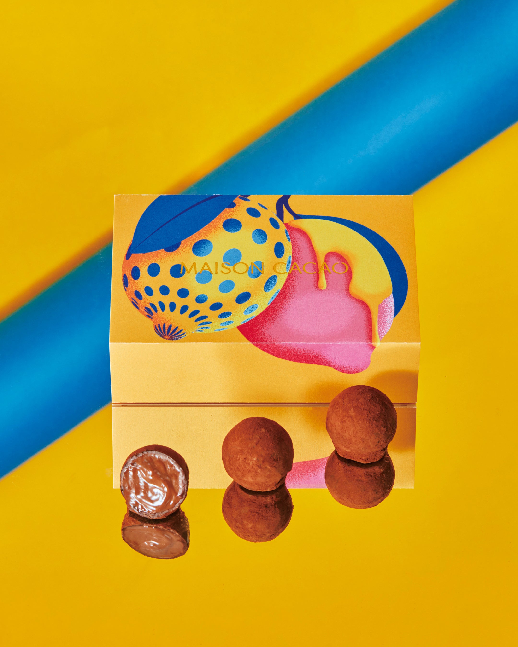カトラリーを使わず、指でつまんで食べるチョコレート。 外側のチョコレートは少し力を入れただけで割れそうなほど繊細ながら、 口の中でパリッと弾けた瞬間に、中から液状のチョコレートが溢れ出します。