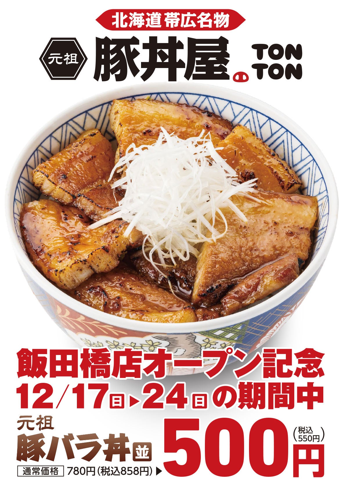 飯田橋店のオープンを記念して、12/17(日)〜24(日)の期間中、TONTON自慢の「豚バラ丼〈並〉」をオトクな価格にて提供いたします。