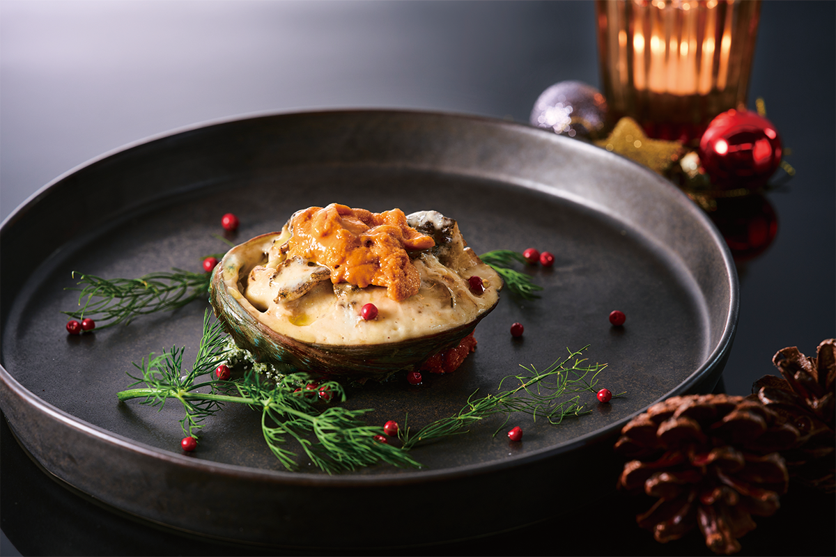 阿波牛ローストビーフとキャビアのマリアージュ、アトランティックサーモンとイクラのカルパッチョ、伊勢海老とマスカルポーネチーズのクラムチャウダー、活アワビのコキーユ、阿波牛フィレ肉とフォアグラのロッシーニ、ズワイ蟹とカラスミのクリームパスタ、デザート