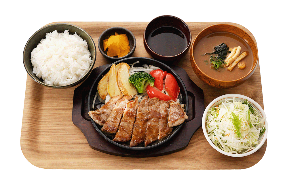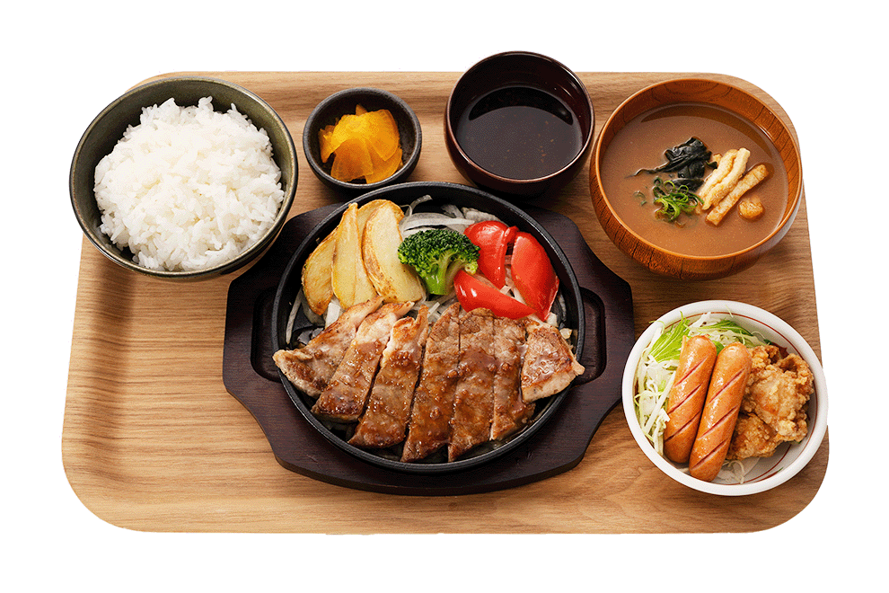柔らかな肉質で脂の旨味がしっかりと感じられる「サーロインステーキ定食」のほか、さらにソーセージ2本と鶏の唐揚げ1個がセットになった「サーロインステーキデラックス定食」もご用意しました。