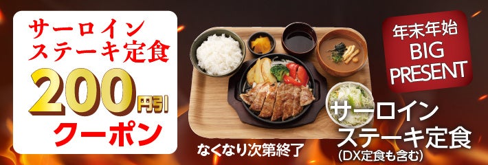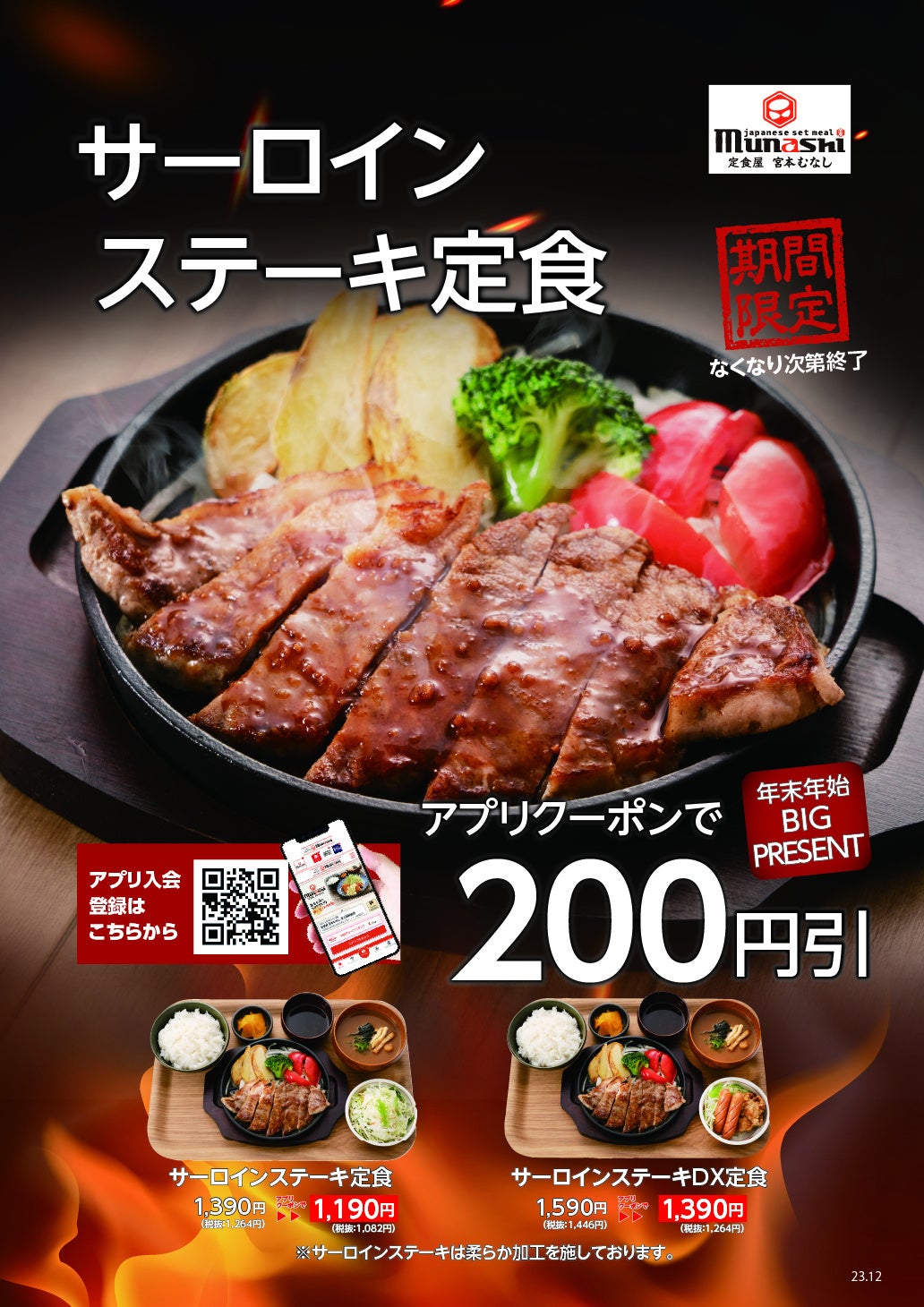 宮本むなしでは、デジタル技術を活用することで、さらにお得に、便利にご利用いただけるようブランド体験のデジタル化(DX)取り組みを進めております。宮本むなし公式アプリでは、年末年始の特別キャンペーンとして「サーロインステーキ定食 各種200円引き」クーポンを配信しますので、大変お得にご利用いただけます。