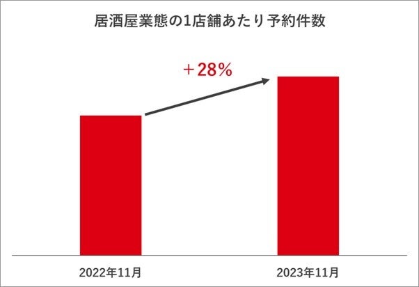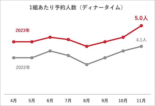 またコロナ禍では少人数化傾向にあった予約1組あたりの人数についても、2022年11月の4.1人から2023年11月は5.0人まで増加しており、12月は久しぶりに友人や同僚と集まり盛大に忘年会を楽しむ機会が増えることが期待されます。