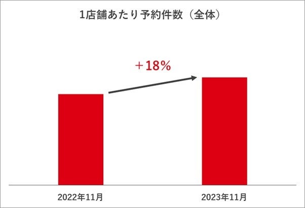 2023年11月において「楽天ぐるなび」へネット予約を掲載する飲食店1店舗あたりのネット予約件数は、前年同月比18%増となりました。