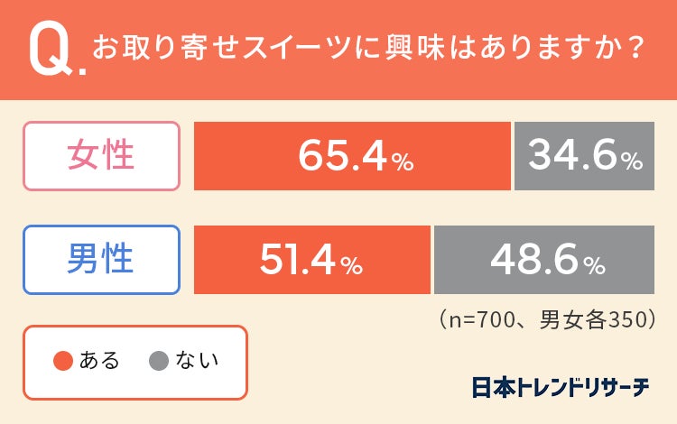 ■女性の65.4%、男性の51.4%が「お取り寄せスイーツに興味がある」