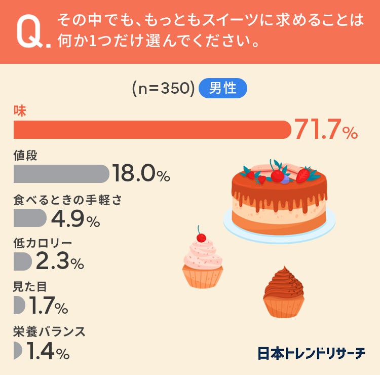 男性も86%とほとんどの方がスイーツに「味」を求めているようです。