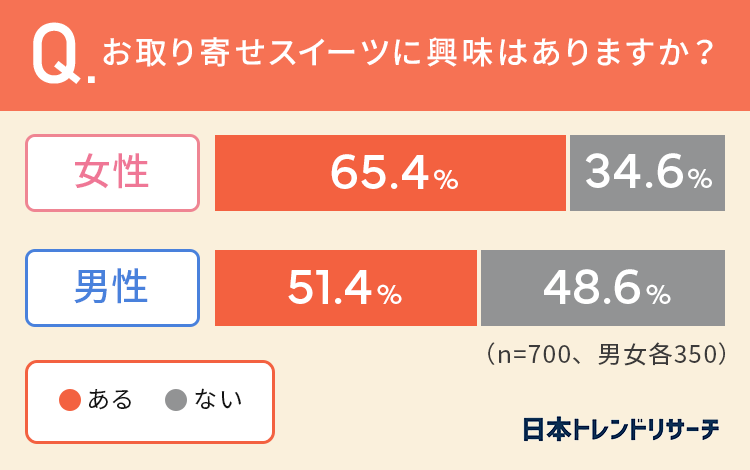 女性の65.4%、男性の51.4%といずれも半数以上の方が「お取り寄せスイーツに興味がある」と回答しました。