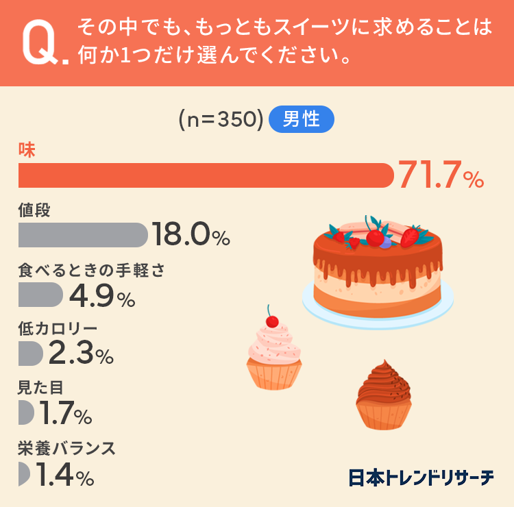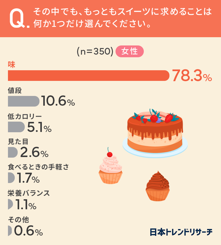 そのなかでも、もっともスイーツに求めることは何か1つだけ選んでもらいました。