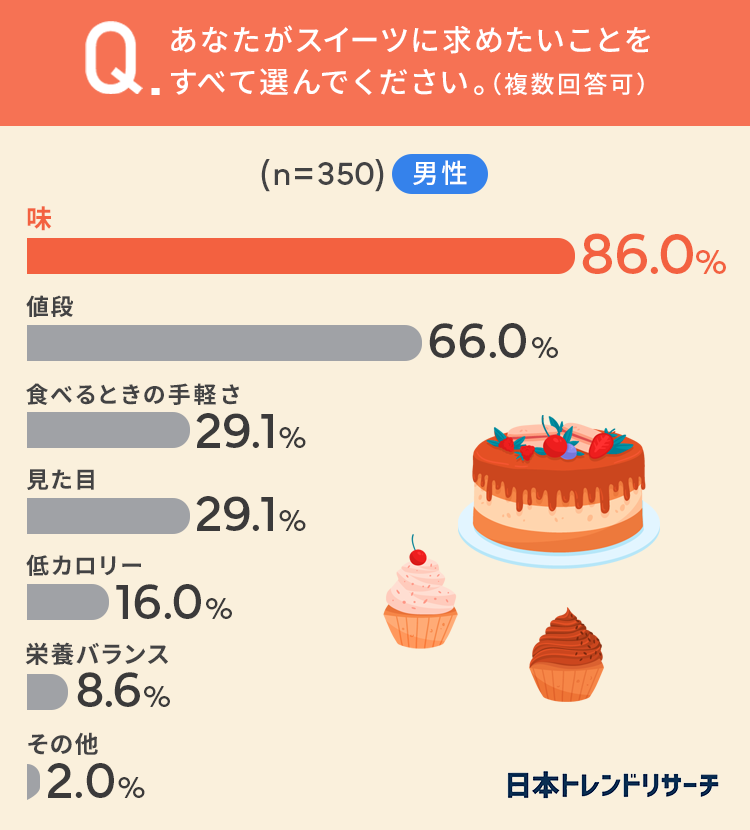 男性も86%とほとんどの方がスイーツに「味」を求めているようです。