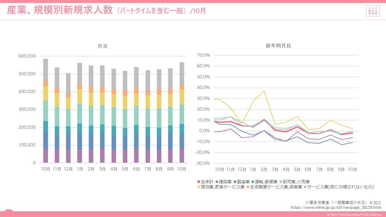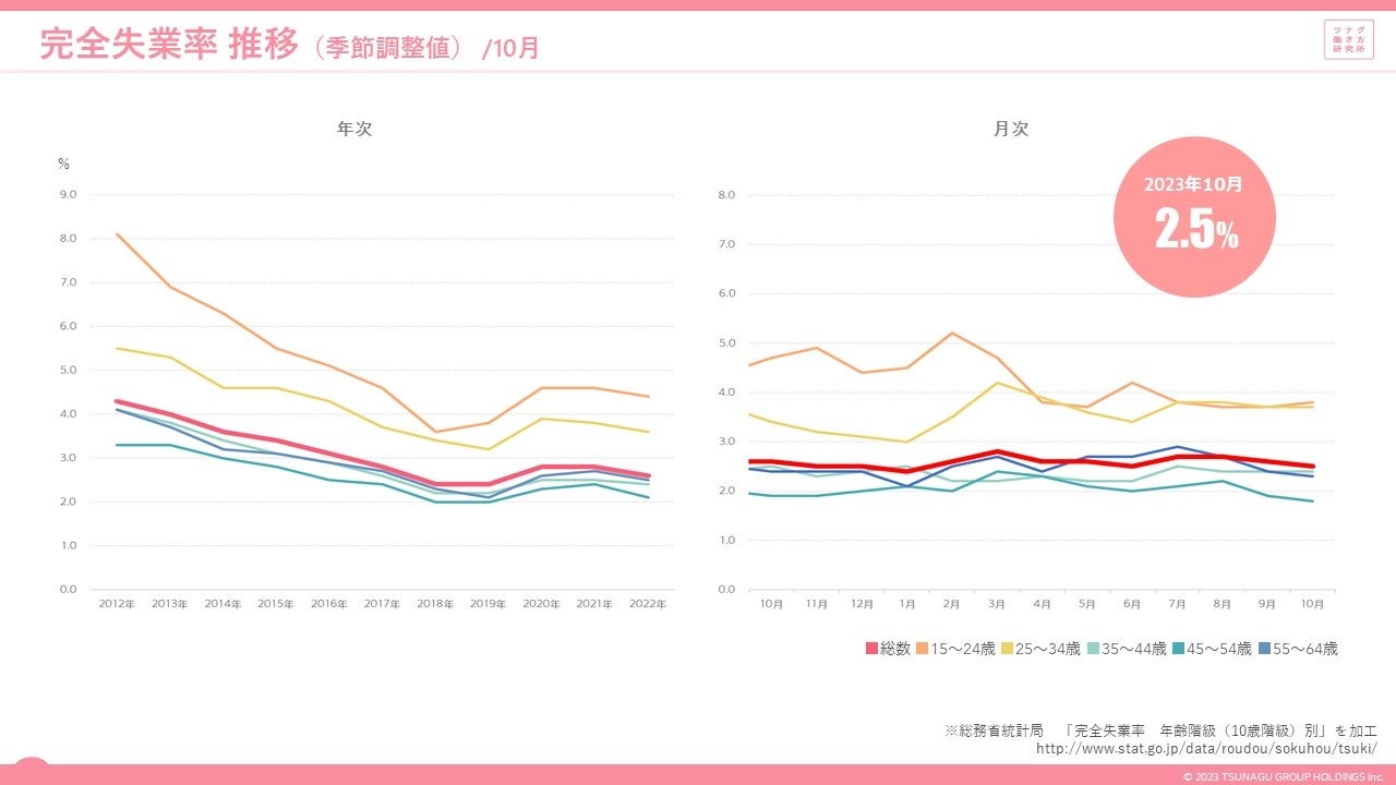 多様な働き方の調査研究機関「ツナグ働き方研究所(拠点:東京都千代田区/所長:平賀充記)」は、官公庁などが発表する労働市場関連のデータをキュレーションしつつ、分かりやすくまとめた「労働市場データレポート」を毎月発表していきます。今回は12月上旬に発表された最新データをもとに2023年10月度レポートについて、とりまとめましたのでご報告いたします。