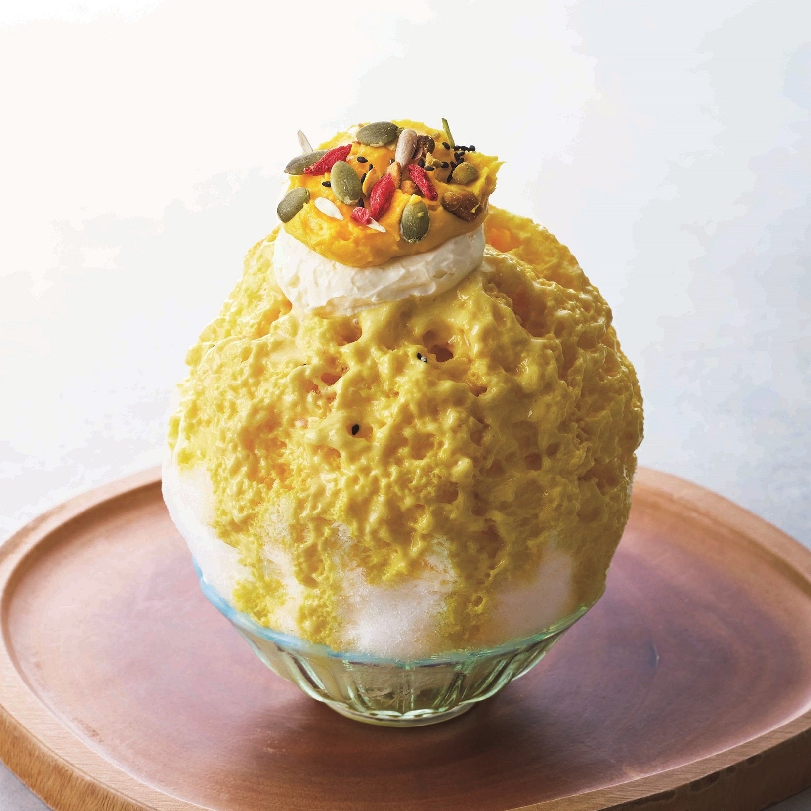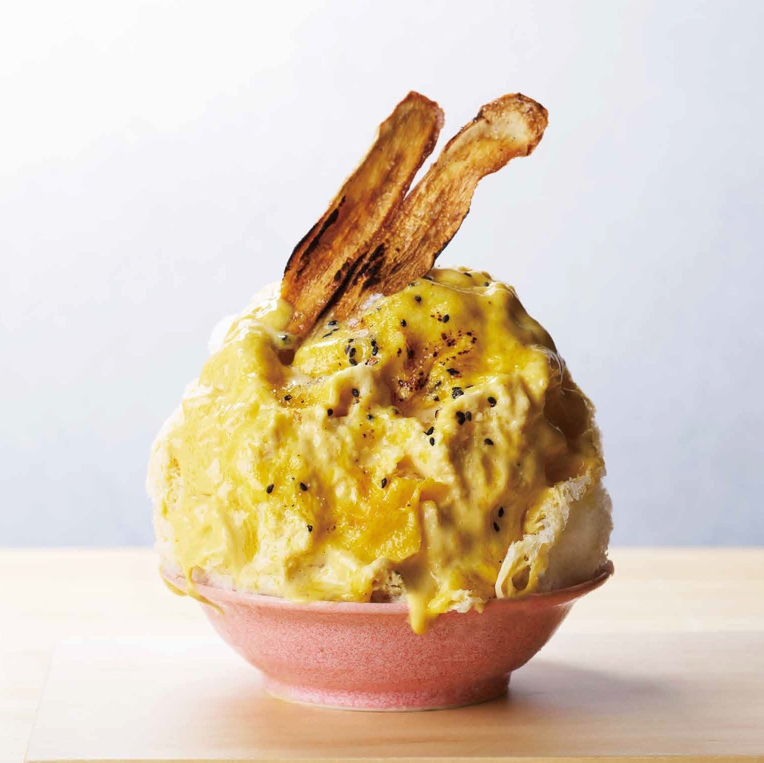 卵とかぼちゃのソースをかけたプリン風味のかき氷。