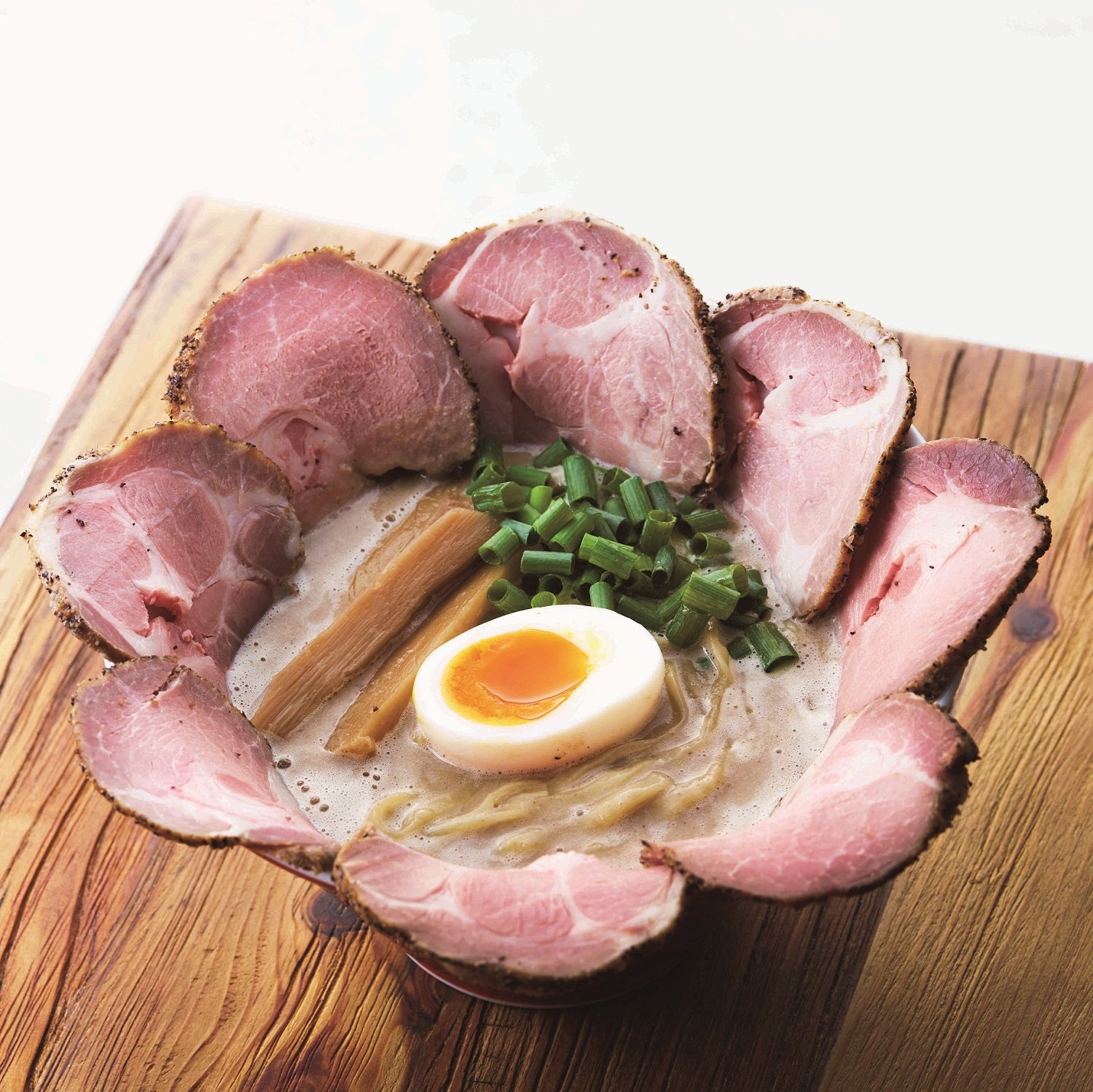 四元豚のレアチャーシューを豪快に盛りつけた自慢の豚骨魚介ラーメン。