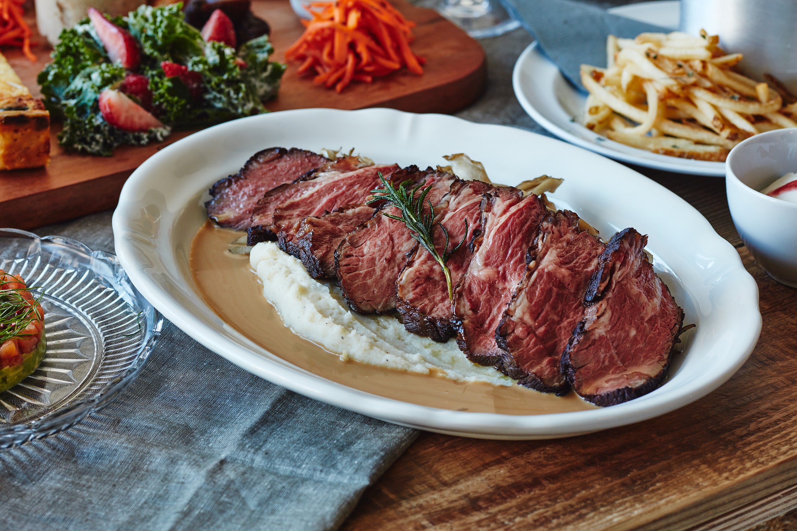 さらにトリュフ塩の香るフライドポテトと、メインディッシュには贅沢にローストビーフをご用意し、お酒の進むお料理が並びます。
