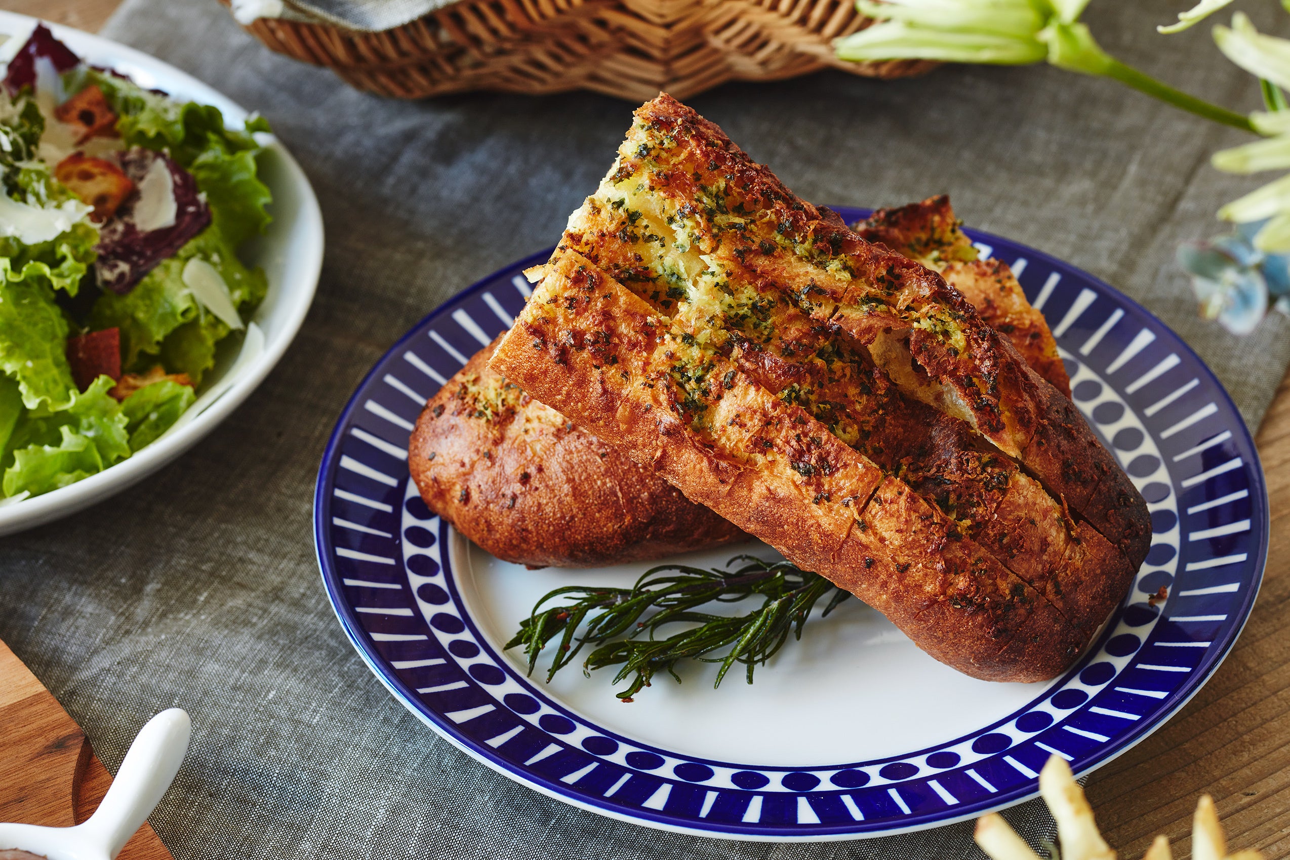 色とりどりの前菜に、手作りのシーザードレッシングで合わせた新鮮野菜のサラダや、ブーランジェリーカフェならではの焼き立てパンで作るガーリックトーストをご用意しました。