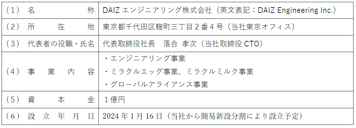 エンジニアリング、ミラクルエッグ及びミルク並びにグローバルアライアンスを推進する子会社を新設することで、意思決定の迅速化及び機動的な事業運営を実現し、DAIZグループの企業価値の更なる向上を目指してまいります。
