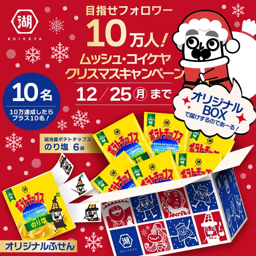 X(旧Twitter)の湖池屋公式アカウントでは、先日「フォロワー100万人」を達成したことを記念し、ファンのみなさまへのありがとうの気持ちを込めて、湖池屋スナック39(サンキュー)袋をプレゼントするキャンペーンを開催。さらに、ムッシュ・コイケヤ アカウントでは、間近に迫る「フォロワー10万人」を目指す企画として、ムッシュ・コイケヤのオリジナルふせんと湖池屋ポテトチップス のり塩を、オリジナルダンボールに入れてプレゼントするキャンペーンを実施します。湖池屋のファンサイト「コイケなおやつ部」でのWEBキャンペーンも開催中ですので、みなさまぜひご参加ください。今後ともご愛顧の程、どうぞよろしくお願いいたします。