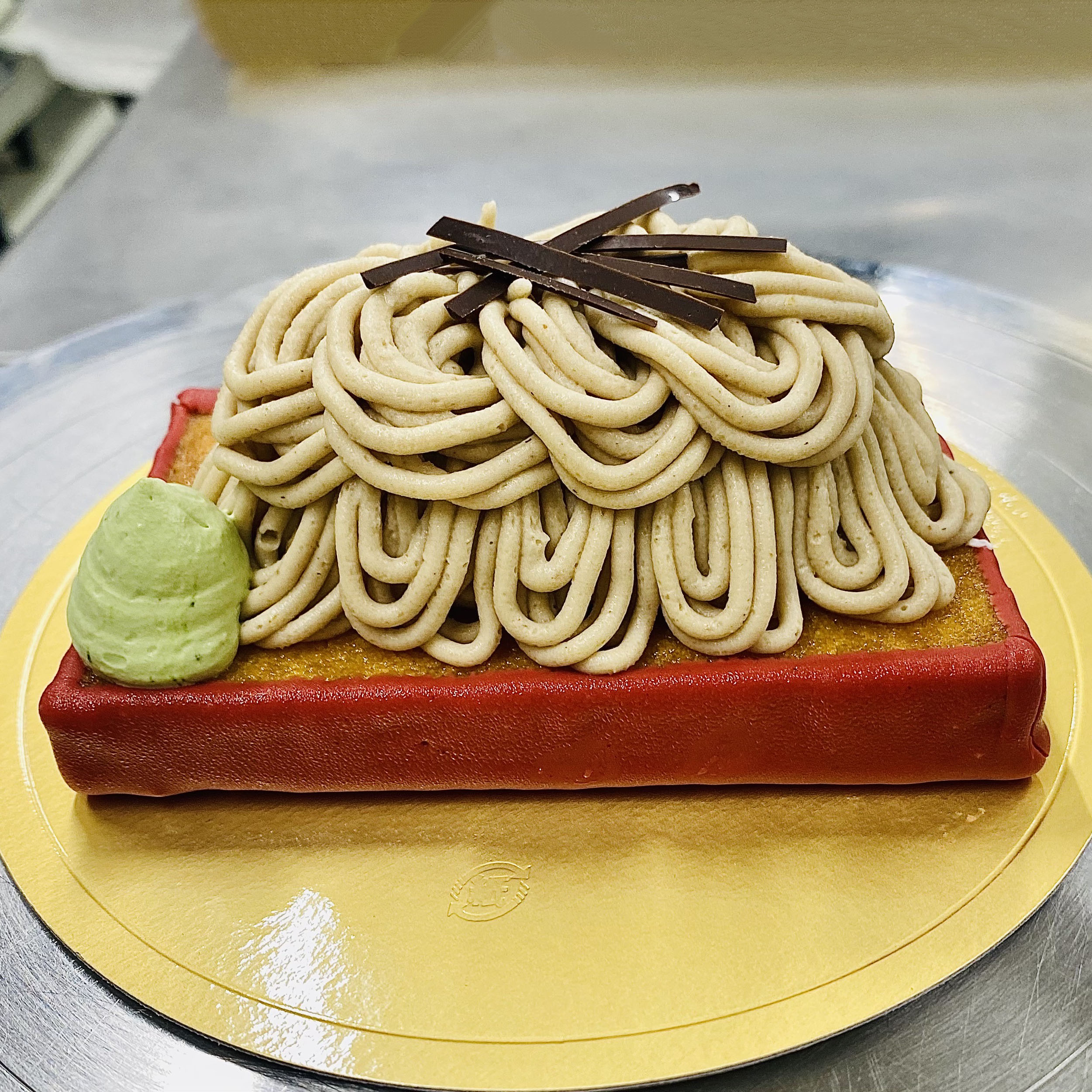年越しモンブランは、約11センチ×7.5センチで、お二人でも十分お召し上がりいただけるほどの大きさです。タルト生地にクリームをこんもりと重ね、その上に、和栗と厳選されたフランス産マロンペーストを加えて作るレドシェーブル自慢のモンブランクリームを絞ります。ワサビに見立てているのは、抹茶クリーム、海苔に見立てたのは、チョコレートです。