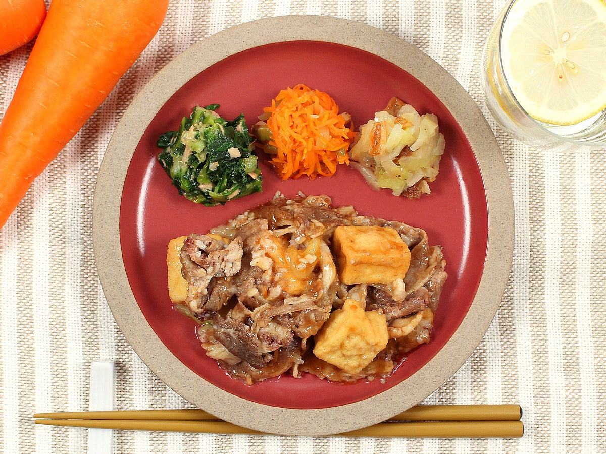 とろ~り中華あんを牛バラ肉と絹揚げにかけました。えのきと白菜をそえているので、ソースとよく絡めてお召し上がりください。