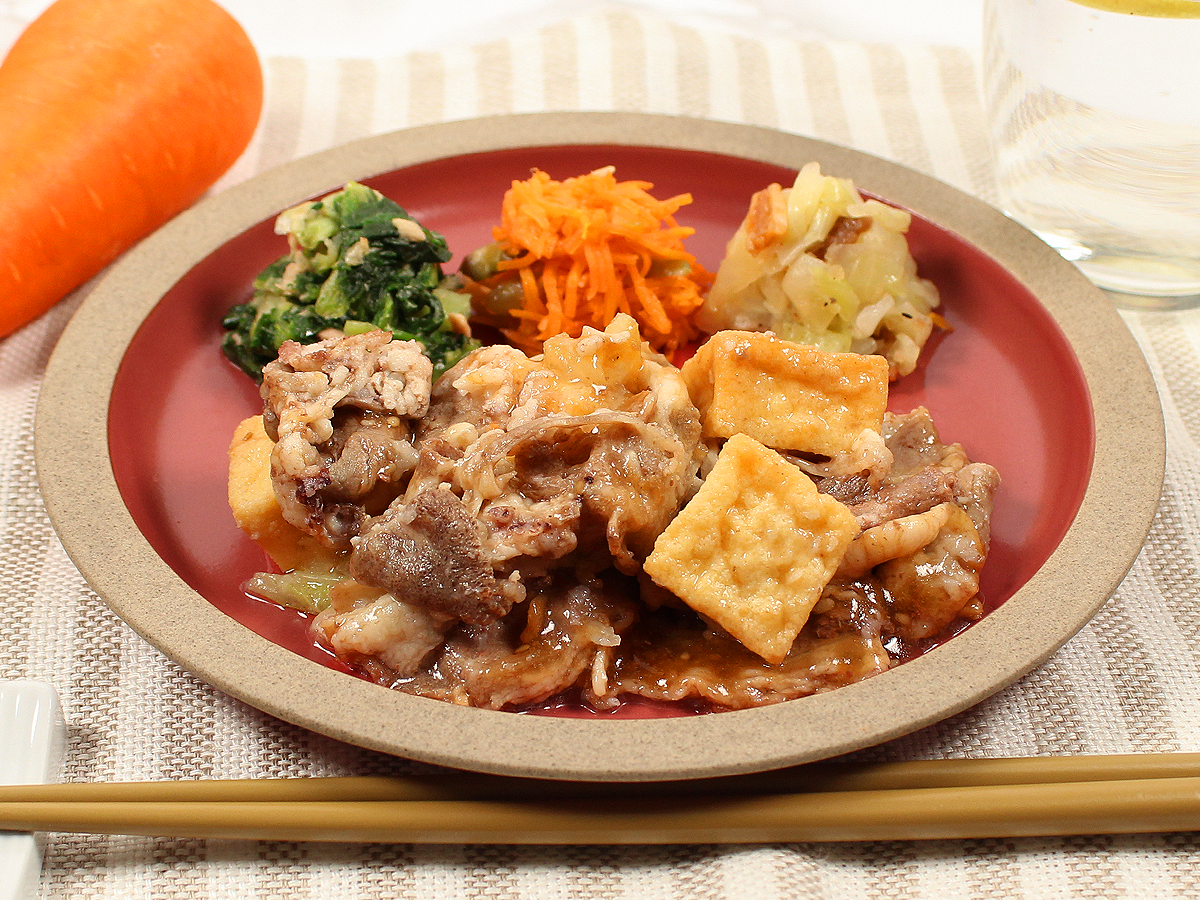 とろ~り中華あんを牛バラ肉と絹揚げにかけました。えのきと白菜をそえているので、ソースとよく絡めてお召し上がりください。
