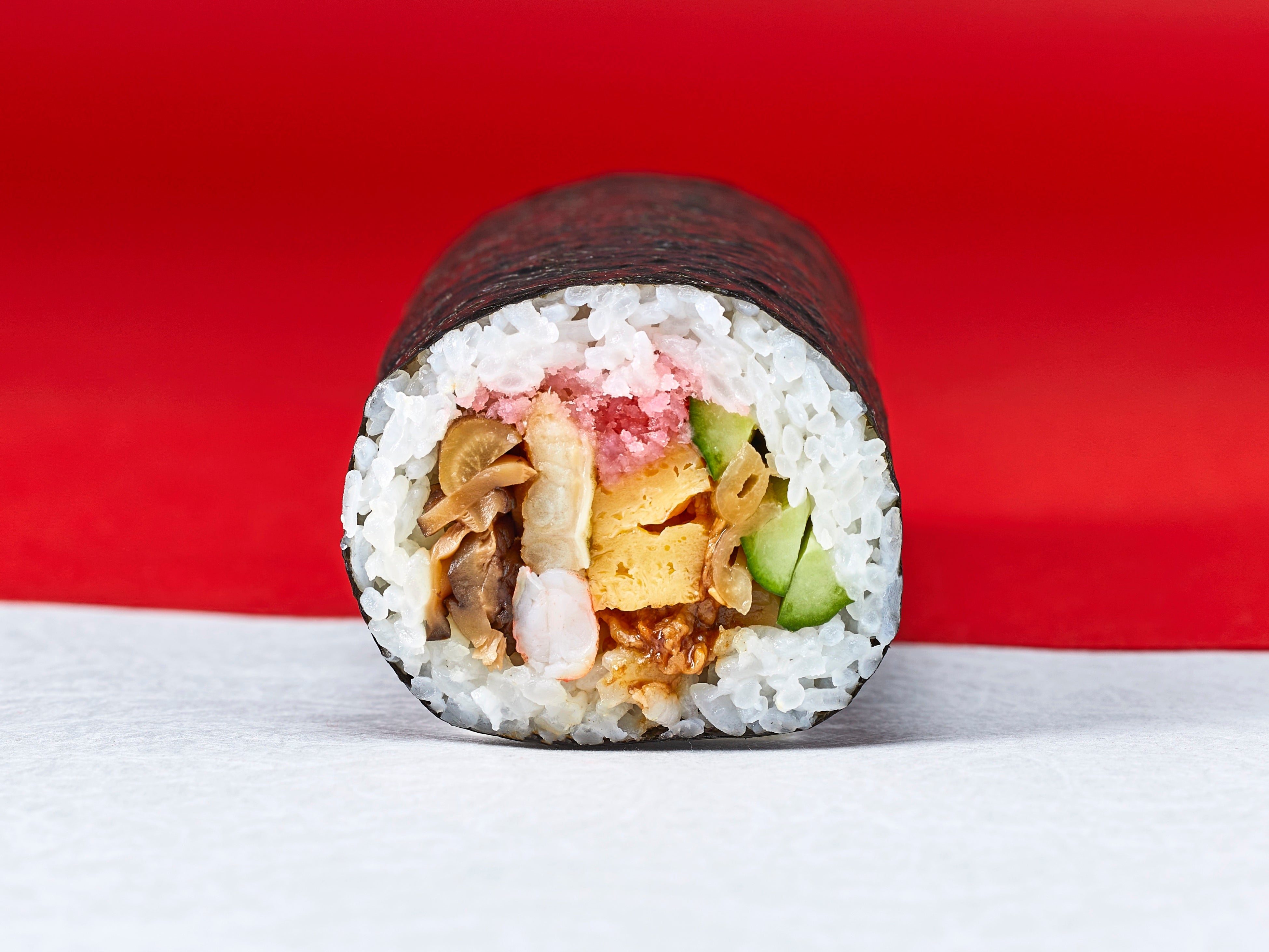 海苔が主役の『恵方巻』の具材も、海苔の風味と合わせて楽しめるものを厳選しています。アナゴ、玉子、かんぴょう、きゅうり、海老おぼろなど、さまざまな味わいと食感を楽しめる9種類の食材を使い、海苔の風味を邪魔せず、お互いの食材の良さが引き立つように仕上げます。
