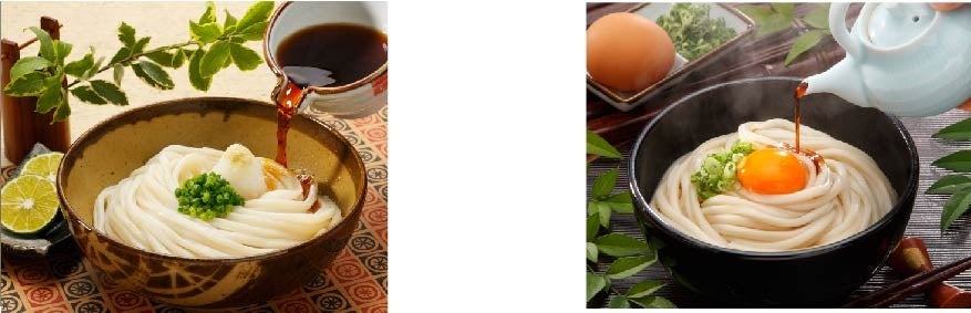 【うどん】さっぱりとすだちでぶっかけ(左)、卵を絡めた釜玉うどんなど。温・冷でお楽しみください