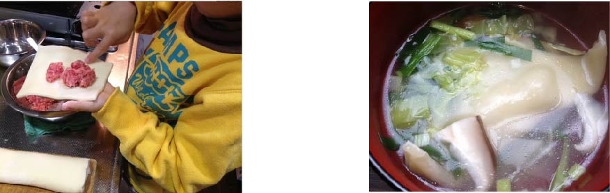 【餃子スープ】 餃子の形に切った麺ロールにひき肉などの餡を包み(左)、餃子スープにアレンジ