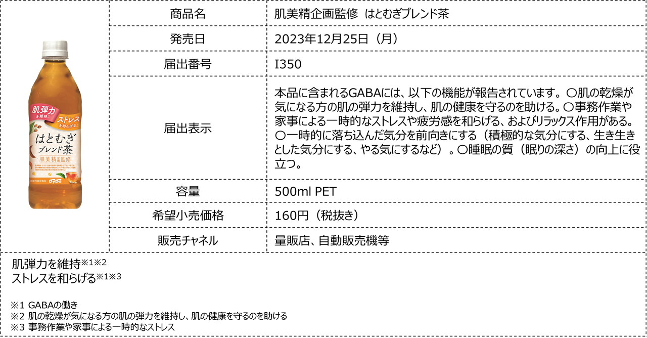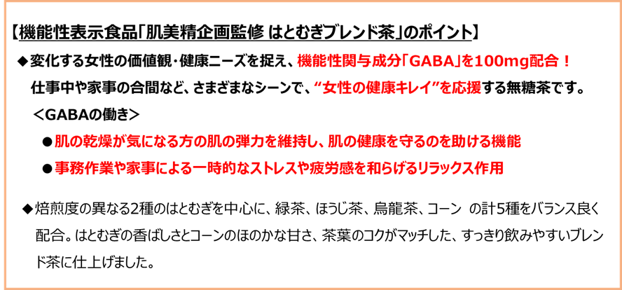 こうした変化する女性の価値観、健康ニーズにお応えするべく、「肌美精企画監修 はとむぎブレンド茶」を、機能性表示食品としてリニューアル。届出表示に基づく機能を記載することで、これまで以上にお客様にとって分かりやすく選びやすい商品に生まれ変わりました。