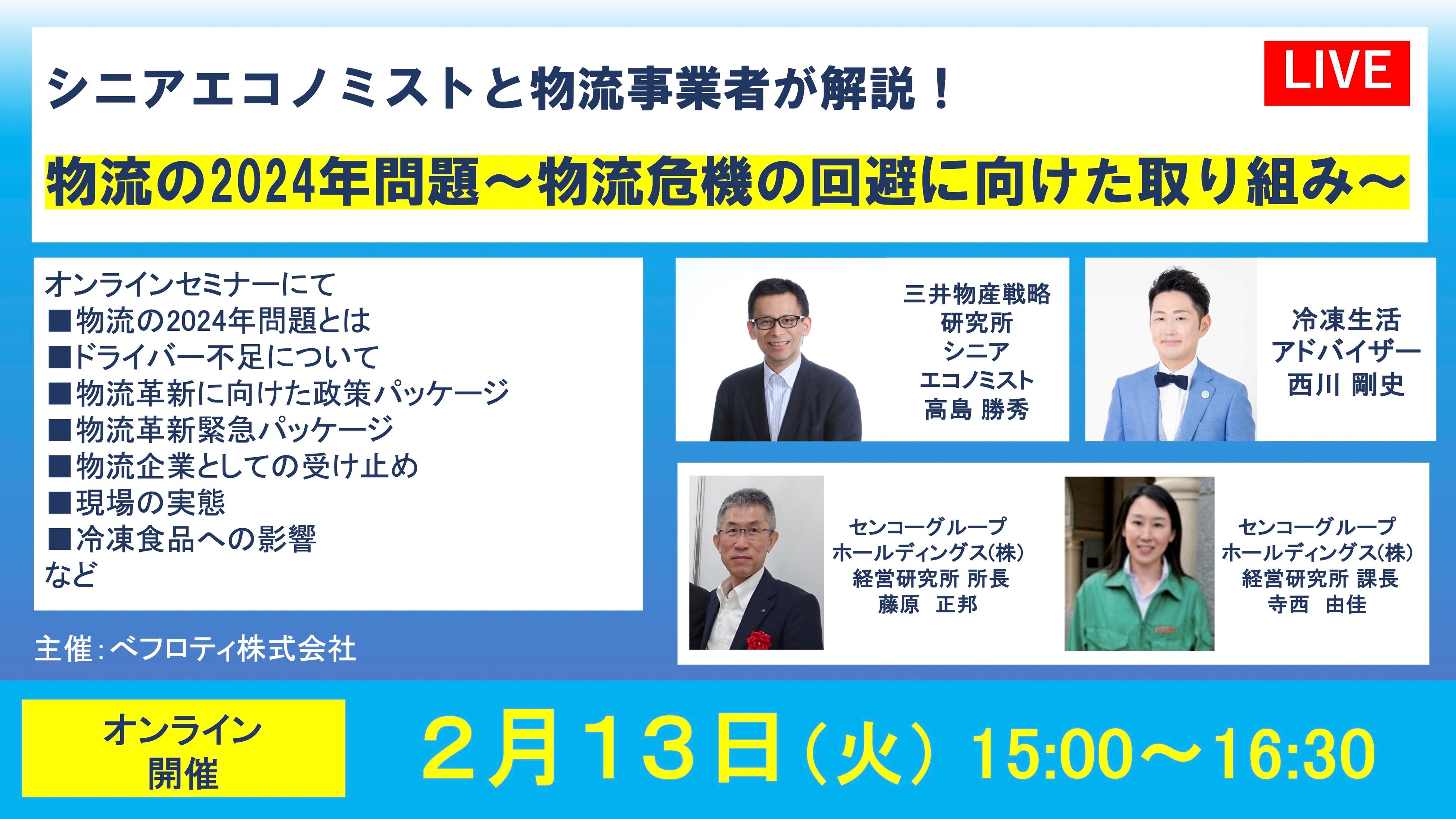 「物流の2024年問題」を直前に控え、物流問題について注目が集まっています。2024年2月13日(火)に「物流の2024年問題~物流危機の回避に向けた取り組み~」オンラインセミナーを開催いたします。オンライン開催のため、どこからでも参加が可能となっております。